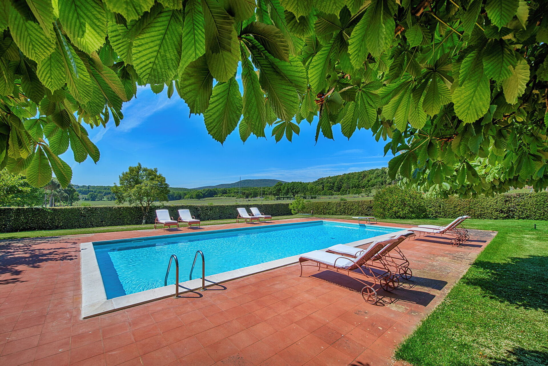Surrounded by rolling vineyards producing a refined selection of "Super Tuscan" wines, the estate invites you to embrace the slow pace of Italy. The grounds are a masterpiece of landscape design, featuring manicured lawns, traditional terracotta planters, and vibrant blooms. At the heart of the garden lies a generous swimming pool, fully outfitted with elegant sun loungers and umbrellas.