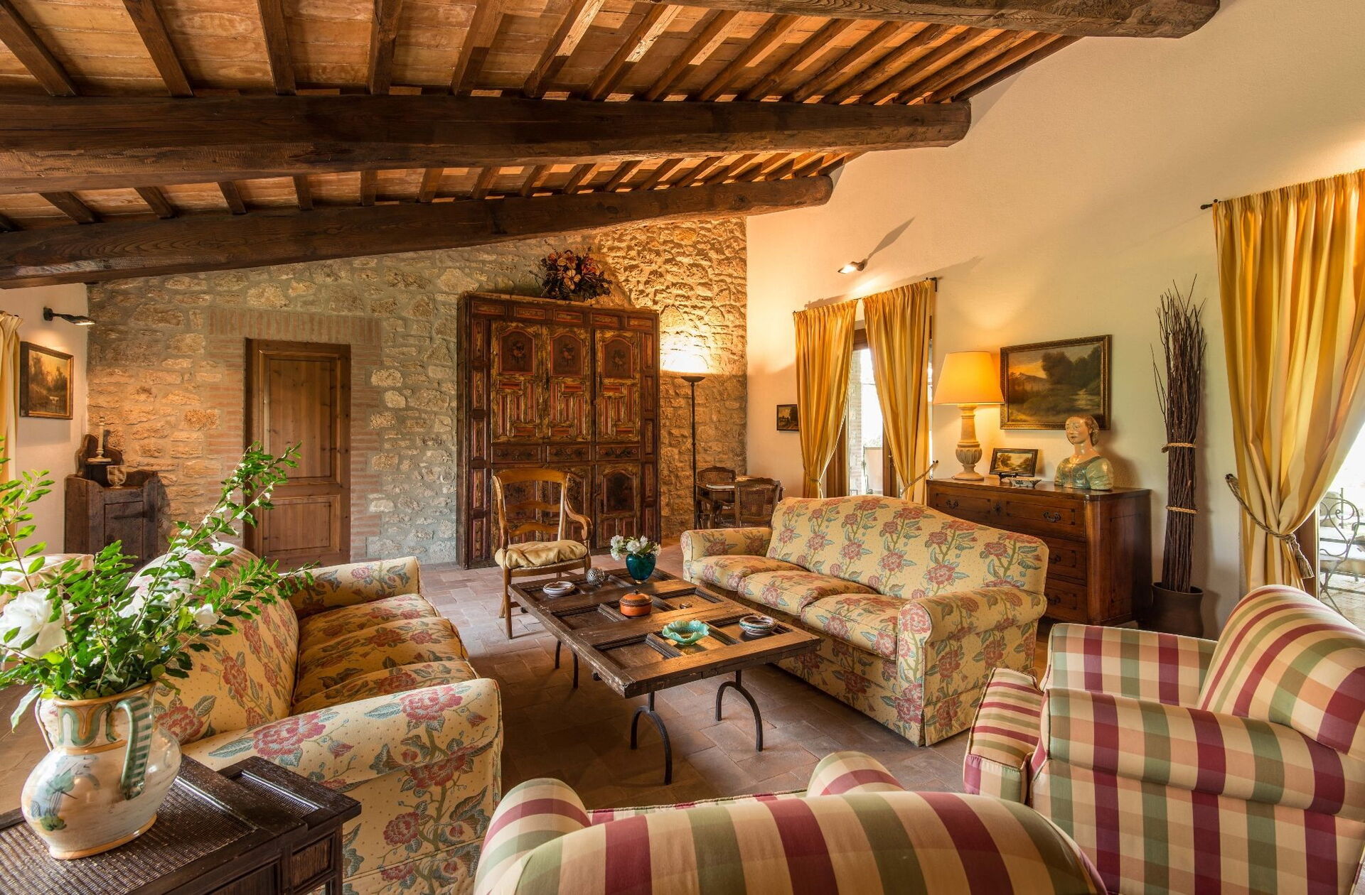 You will find this expansive vacation rental thoughtfully designed to accommodate up to 14 guests across 7 bedrooms and 7 bathrooms, distributed between the main house and an annex. The main house features a ground floor entrance that welcomes you into a first living room furnished with a comfortable Chesterfield couch and a couple of armchairs, offering seating for up to 7 people. Adjacent to this space, you will discover a large living room with a working fireplace and comfortable sofas and armchairs that can seat up to 10 or 12 people, with double doors opening to the covered loggia where you can relax and enjoy the view. Next to the living room, a large dining room with a working fireplace accommodates up to 14 people. The ground floor also includes a large kitchen with a separate dining area, working fireplace, and a table for 8, with double doors opening to a dining patio and second outdoor living room. A guest bathroom serves this level. Completing the ground floor is an air conditioned double bedroom with a king size bed, separate sitting room, and walk-in closet, accompanied by an ensuite bathroom with a bathtub with hand-held shower and separate shower. The first floor sleeps up to 8 people and offers lovely views over the rolling hills and countryside. You will find one master bedroom with a king size bed, working fireplace, and walk-in closet, featuring an ensuite bathroom with shower and double sink. Three additional bedrooms on this floor offer flexible sleeping arrangements with twins that can be put together to form doubles. One of these bedrooms includes a walk-in closet, and their ensuite bathrooms feature either showers or a tub with hand-held shower. The annex, available at extra cost, provides 2 additional air conditioned bedrooms. One twin or double bedroom with twins that can be put together has double doors leading out to the garden and an ensuite bathroom with shower. One double bedroom with a queen size bed has a door leading out to the garden and an ensuite bathroom with shower.
