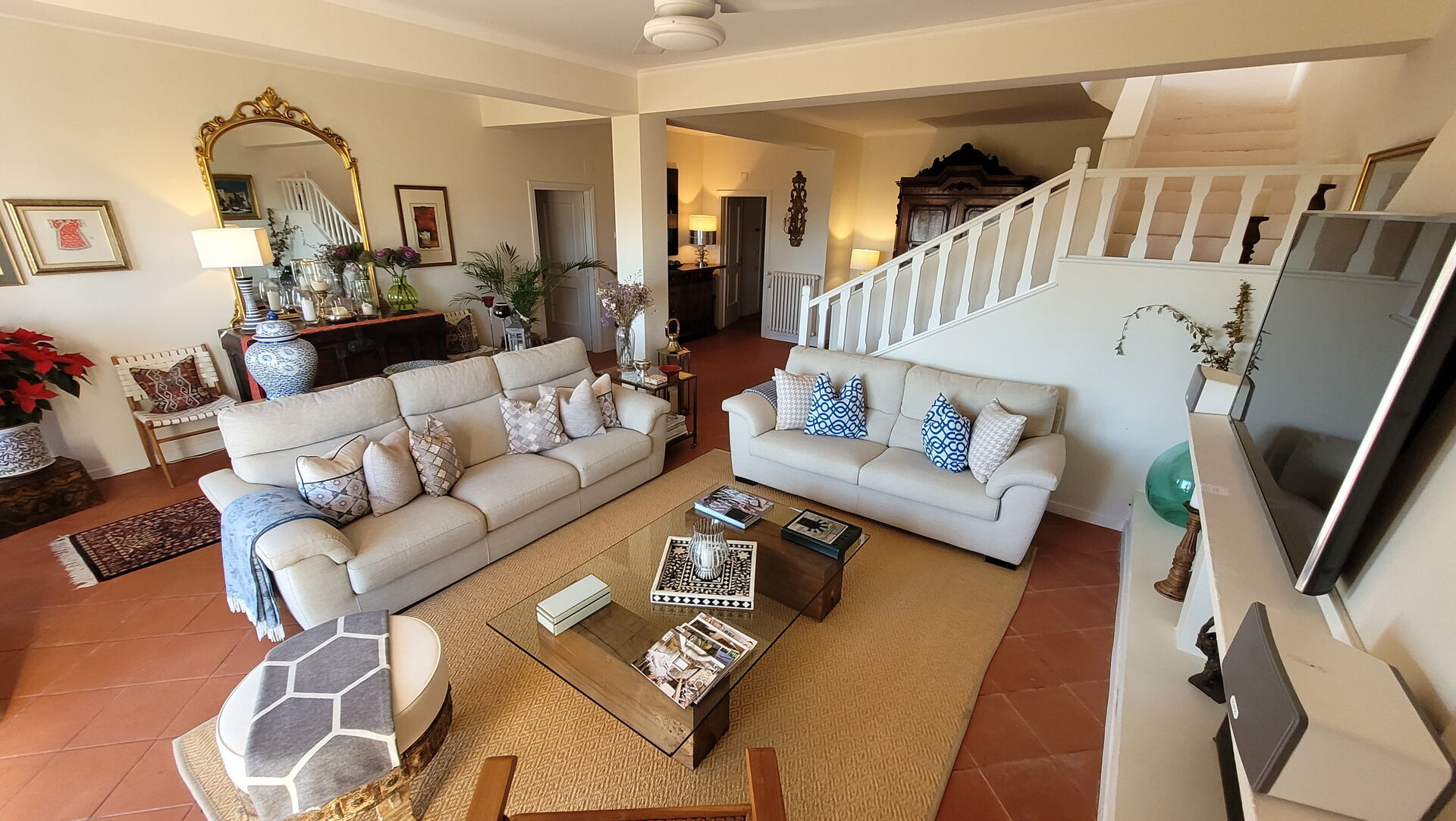 Living room: two sofas (people: 8), fireplace, WIFI internet, internet, television, ceiling fan, mosquito net, exit to the garden.