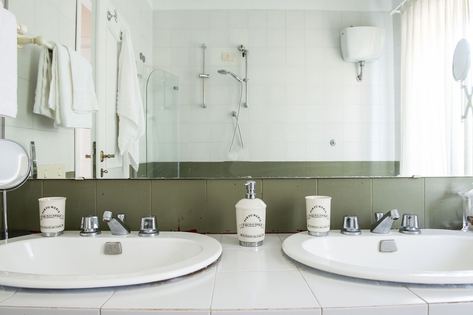 Bathroom 1: basin, toilet, bidet, shower, hairdryer.