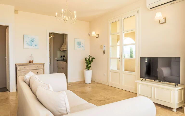 You will find this 3-room villa offers 120 square meters of spacious, comfortable, and tastefully furnished accommodation for your vacation. The living and dining room features a panoramic window, one double sofabed, a dining table, and air conditioning, with direct exit to the veranda. The first bedroom is furnished with one bed and one double bed. The second bedroom also contains one bed and one double bed, with exit to the loggia. The open kitchen is equipped for your culinary needs with a dishwasher, gas stove with 4 gas rings, toaster, kettle, and electric coffee machine. The villa includes a shower, bidet, and WC. You will appreciate the 70 square meter roofed terrace with terrace furniture and box-room, offering beautiful panoramic views of the swimming pool and the countryside.