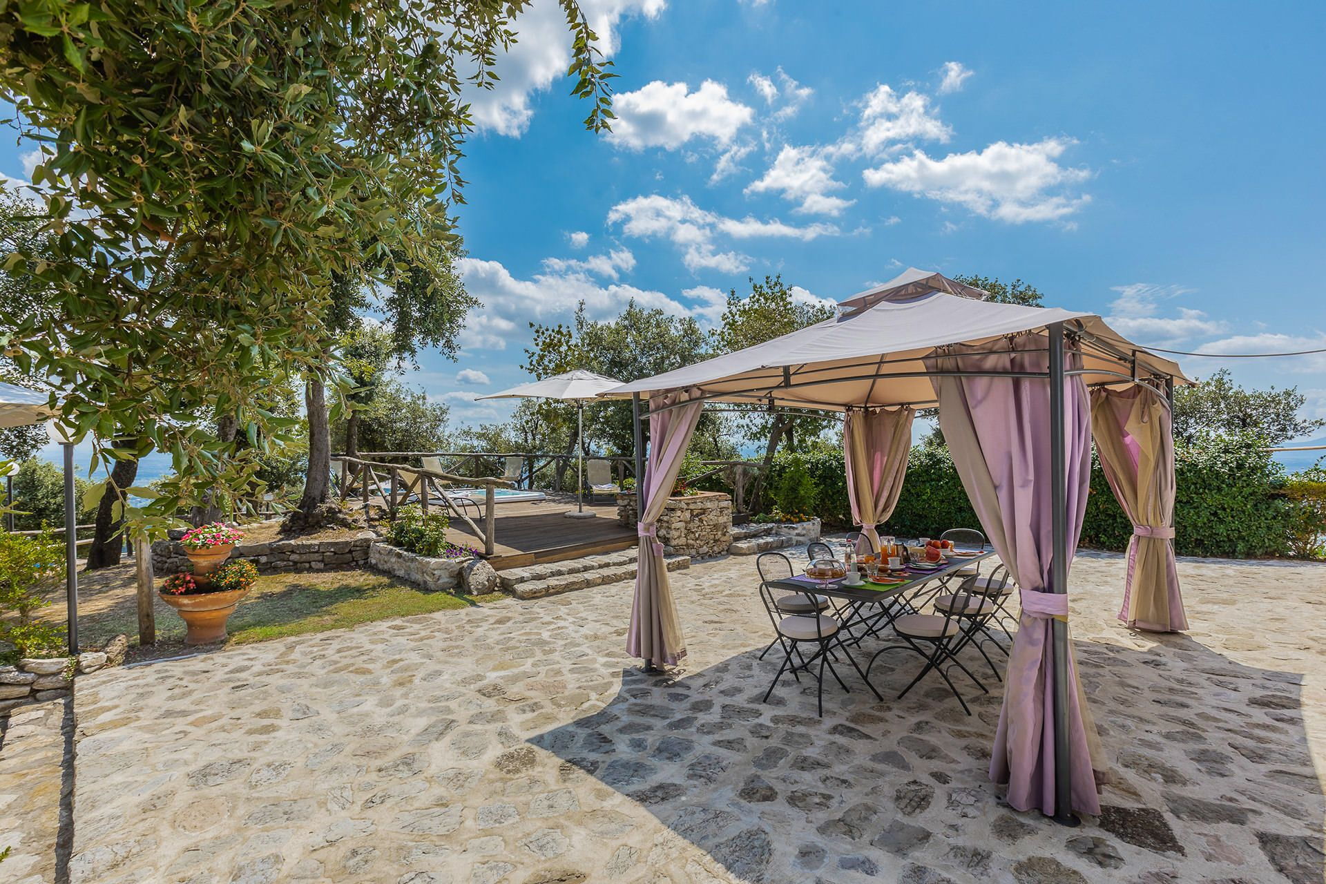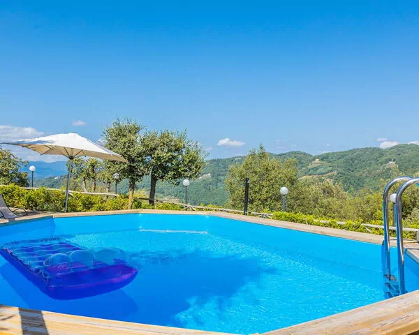 The private garden of Villa Bastiano offers guests a series of enchanting outdoor spaces, each framing a different perspective of the stunning Tuscan valley below. A paved area sheltered by a gazebo and furnished with a table and iron chairs provides the ideal setting for al fresco dining beneath the open sky. The outdoor area also features a private above-ground swimming pool, a solarium, and a Jacuzzi hot tub, all thoughtfully equipped with umbrellas and sun loungers to ensure maximum relaxation. Whether you choose to unwind by the pool, soak in the hot tub, or simply take in the sweeping views of the valley and the surrounding Tuscan landscape, the outdoor spaces of Villa Bastiano offer a true sense of paradise.