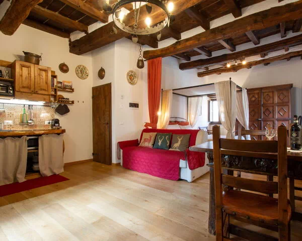 "Maghinardo" is a charming 1-room apartment of 42 m2, situated on the 1st floor, and designed to accommodate a maximum of 4 guests. The apartment features 1 bedroom equipped with 1 double bed and an open-hearth fireplace, which serves as a decorative element. The living and sleeping area includes 1 sofabed, offering flexible sleeping arrangements for additional guests. The kitchen is fully integrated into the living space and comes with a dining table, making it a practical and welcoming area for meals. The bathroom is composed of a shower, bidet, and WC, representing the 1 bathroom available in the unit. Wooden floors run throughout the apartment, adding warmth and character to the overall aesthetic. A private patio of 8 m2, partly roofed and furnished with terrace furniture, can be accessed directly from both the living area and the kitchen, offering a beautiful view of the city.