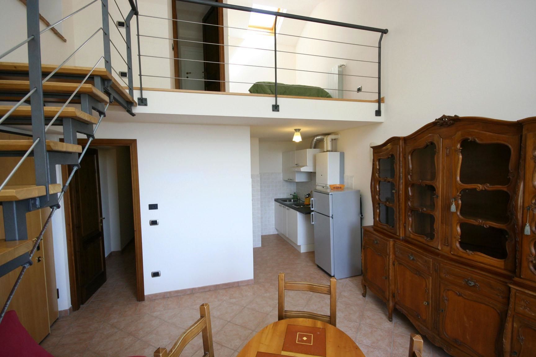 1st floor: living-room (TV) with double sofa-bed, dining area and kitchen corner (freezer), large double bedroom with extra single bed, bathroom with shower. Access (from the living-room) to an open gallery with French bed and bathroom with shower.