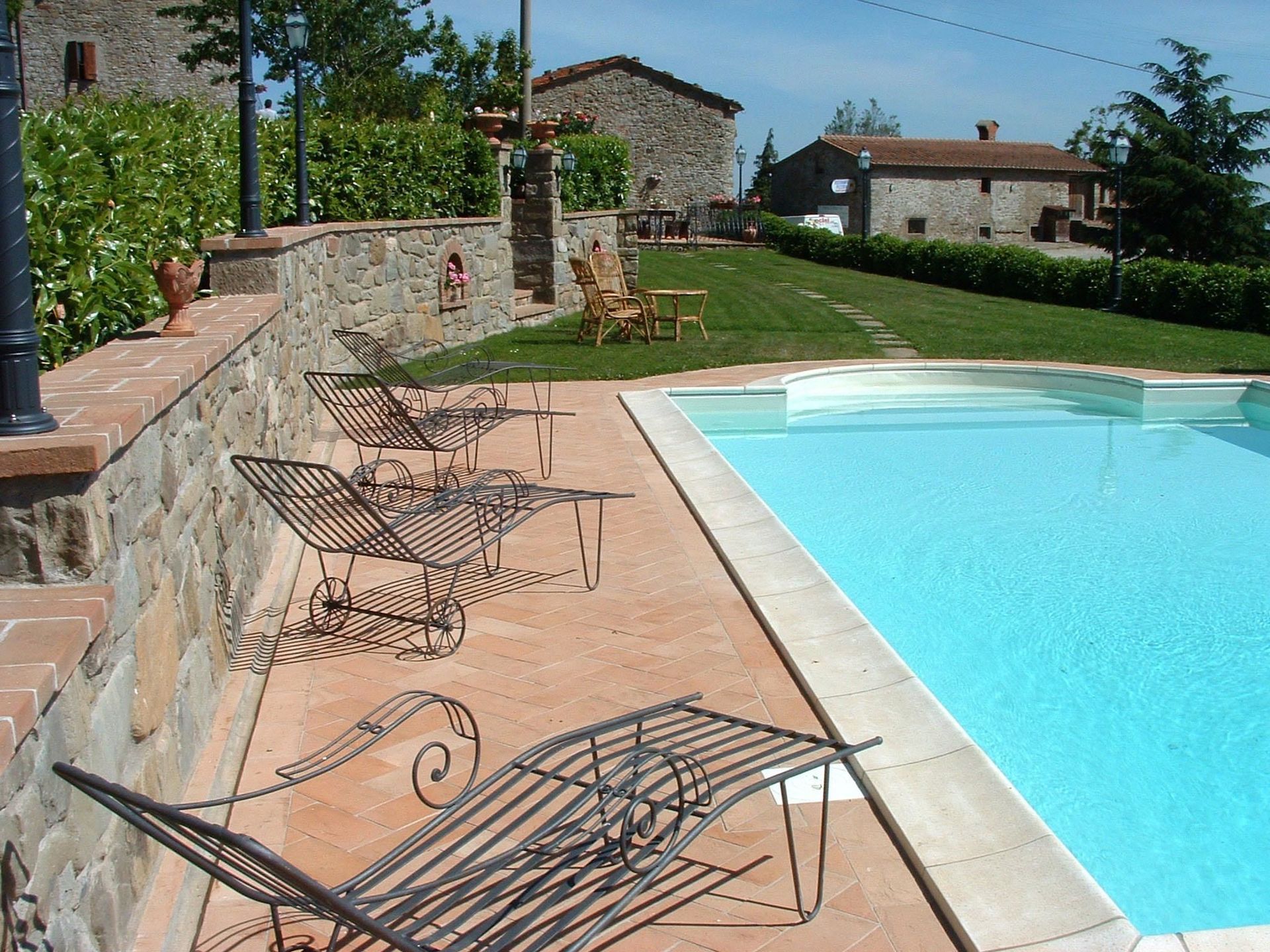 Distances: a food shop is 2 km away, the charming medieval town of Cortona with all kinds of shops 4 km, Foiano della Chiana with golf course approx. 15 km, Arezzo 30 km, Perugia 45 km. Lake Trasimeno with equipped beaches is in a 20-minute drive. Some beautiful renowned towns like Assisi, Montepulciano, Chianciano Terme and Chiusi are within 40 km. A tennis court is at 2 km. A road passes close by the villa.