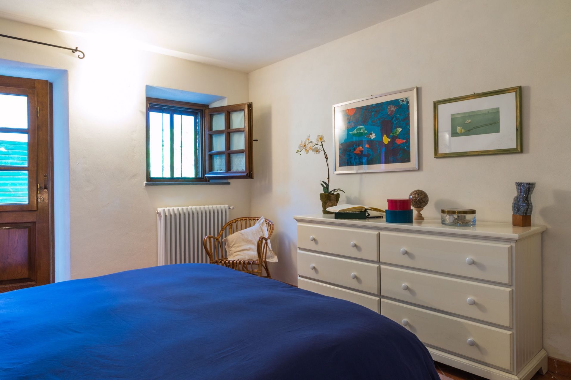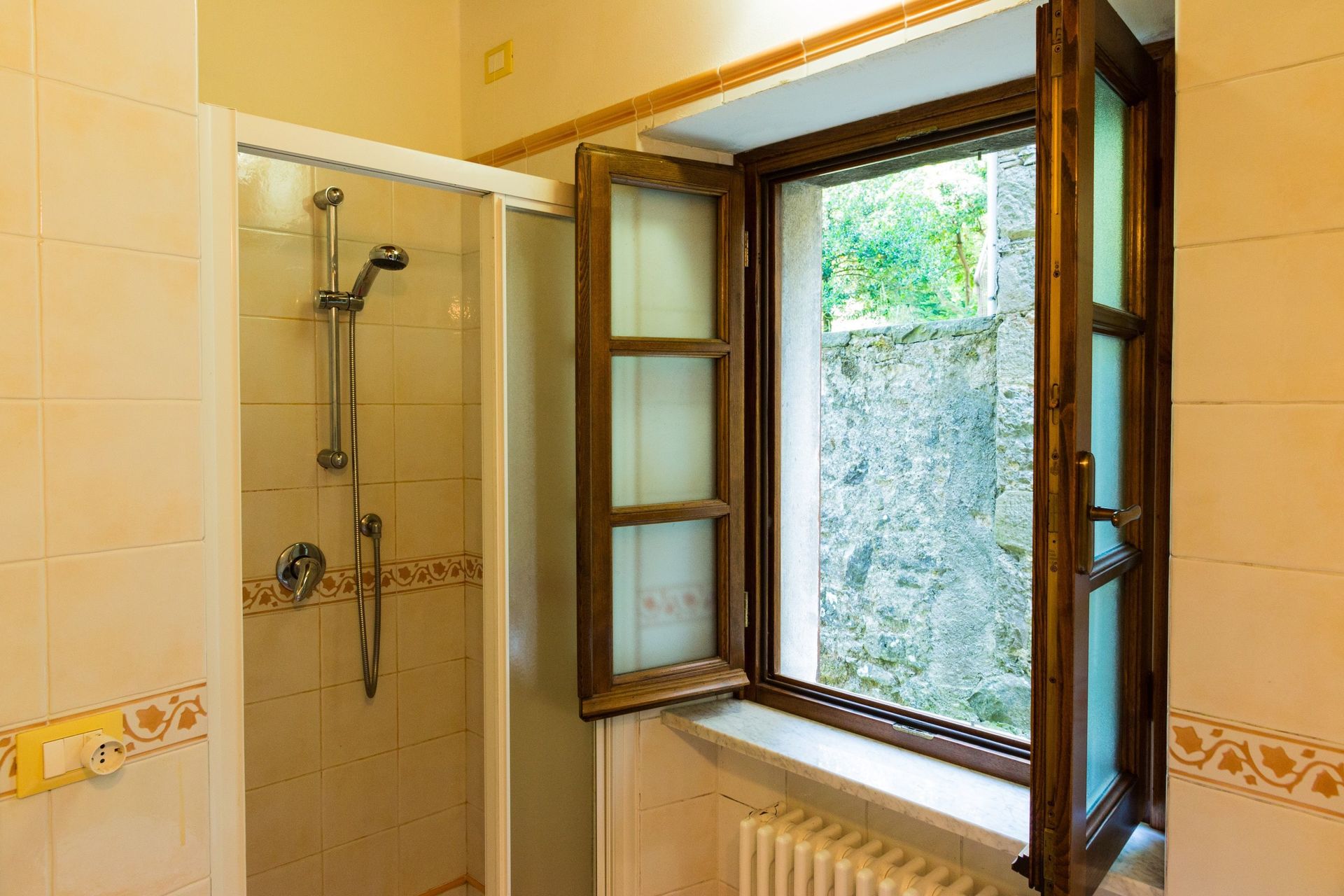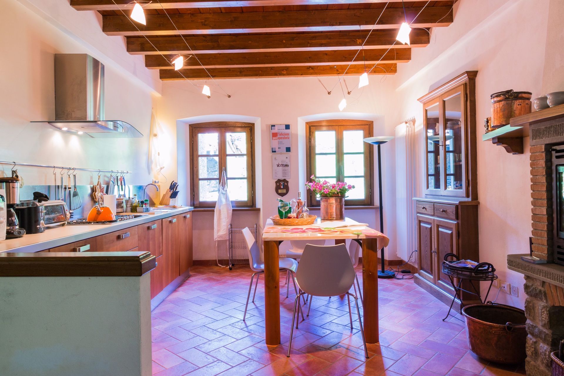 The house is fully furnished with all new or antique pieces (Tuscan pieces from the 19th century), except for a wardrobe. The light fixtures are lavish and we have provided a television (satellite), radio and CD player. We have not yet installed a telephone (there is a public phone in town if you don't have a mobile), but telephone, computer, and internet access are available at our office. A central heating system (gas) has also been installed. And, naturally, a working fireplace adorns the second floor, as how would a mountain house be complete without one!