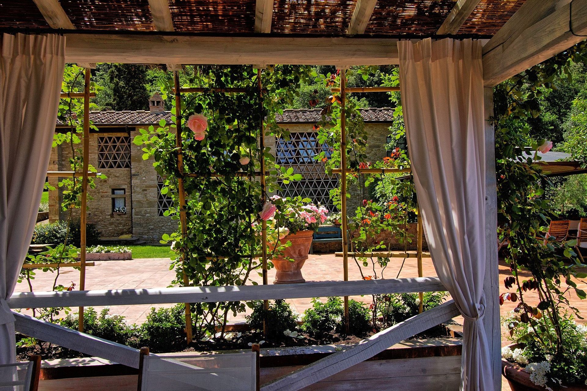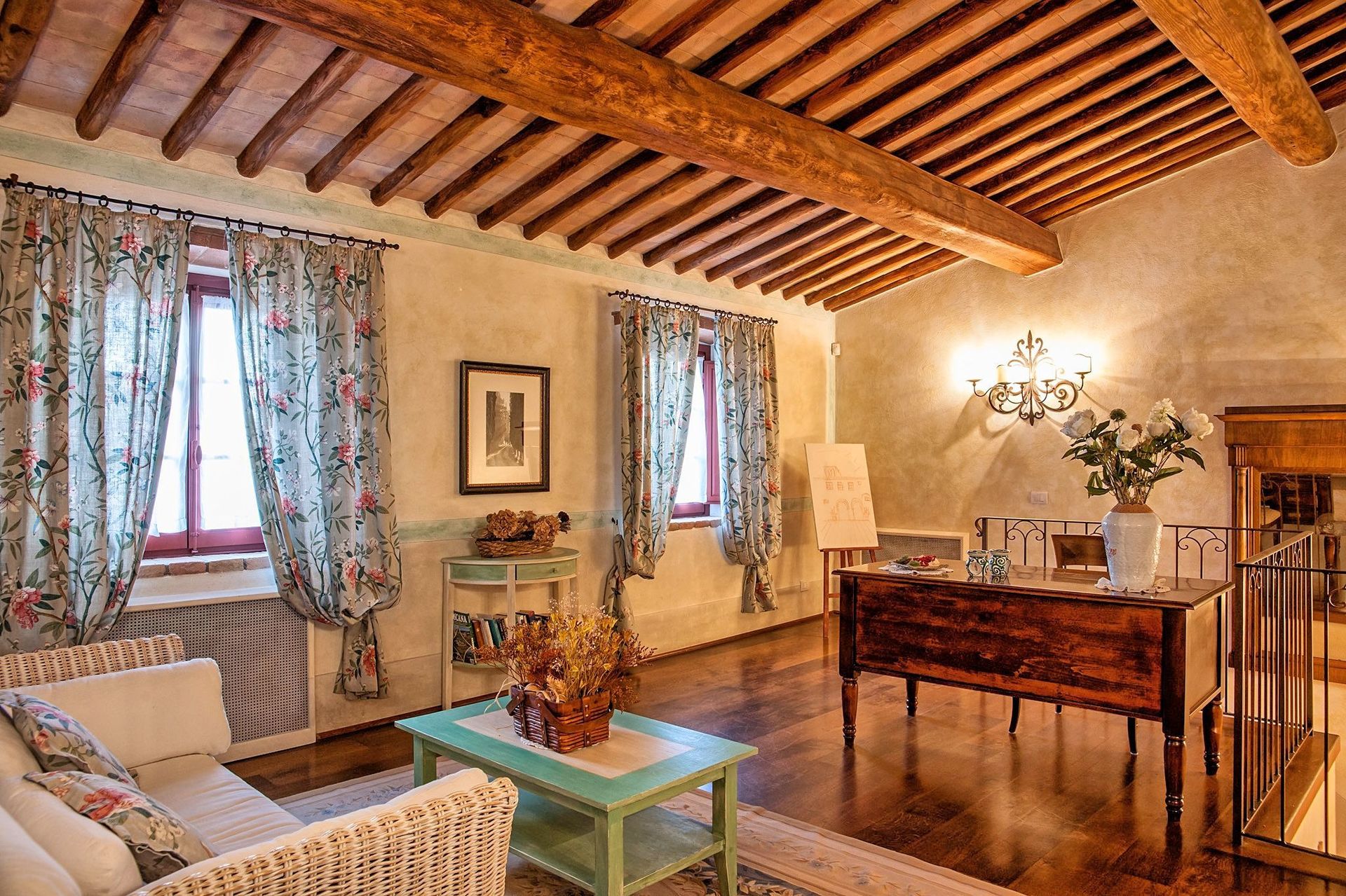 Beautiful private villa with swimming-pool situated in panoramic location on the Tuscan hills, between Florence and Siena. This splendid property has been recently restored preserving its original architectural features and has been turned into an elegant villa sleeping up to 16 people and an adjoining outbuilding for 8 people (rentable upon request only together with the main villa) allowing a total number of 24 guests. Both the villa and the outbuilding are tastefully furnished and offer spacious and extremely comfortable interiors.