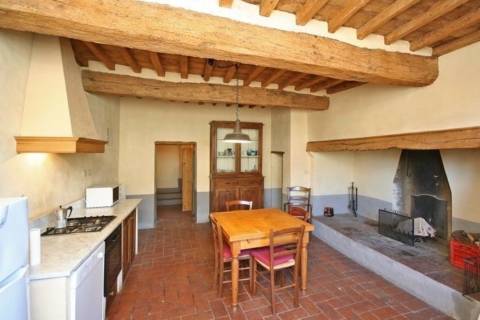 1st floor (accessible via a large outdoor staircase): dining area with big fireplace and access to the kitchen (oven, freezer, dishwasher), small laundry with washing-machine, bathroom with bathtub (without window).