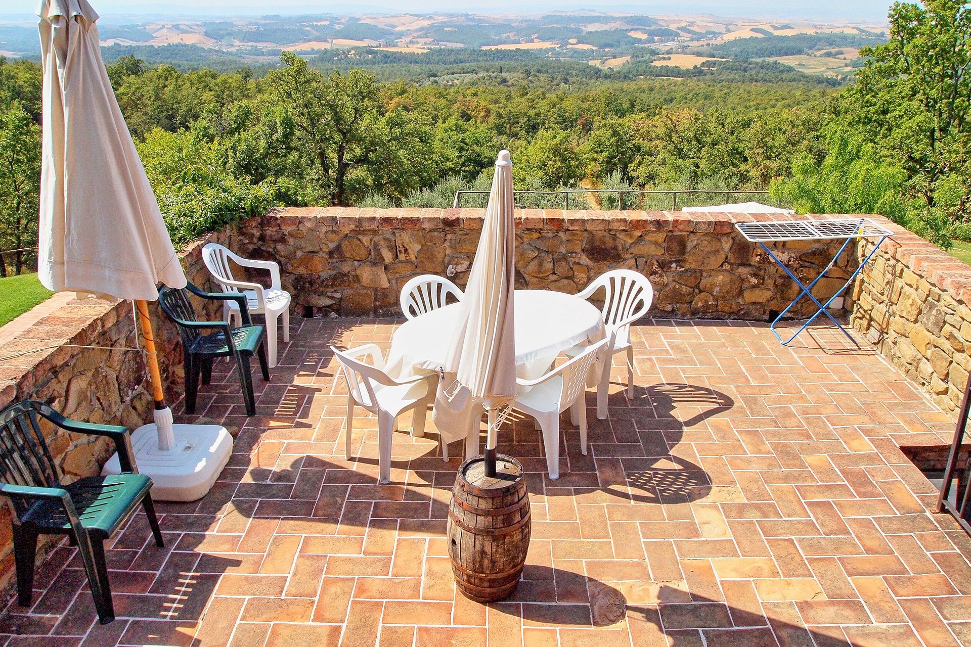 Four nice apartments in a farmhouse situated on a large farming estate (30 hectares) with woods, vineyards, horses and “cinta-senese” breeding (kind of pig typical of the area around Siena). This property, offering a total of 4 units, is in quiet and panoramic location and enjoys extensive views over the surrounding landscape. All of the apartments are simply but nicely furnished, in a typical Tuscan style.