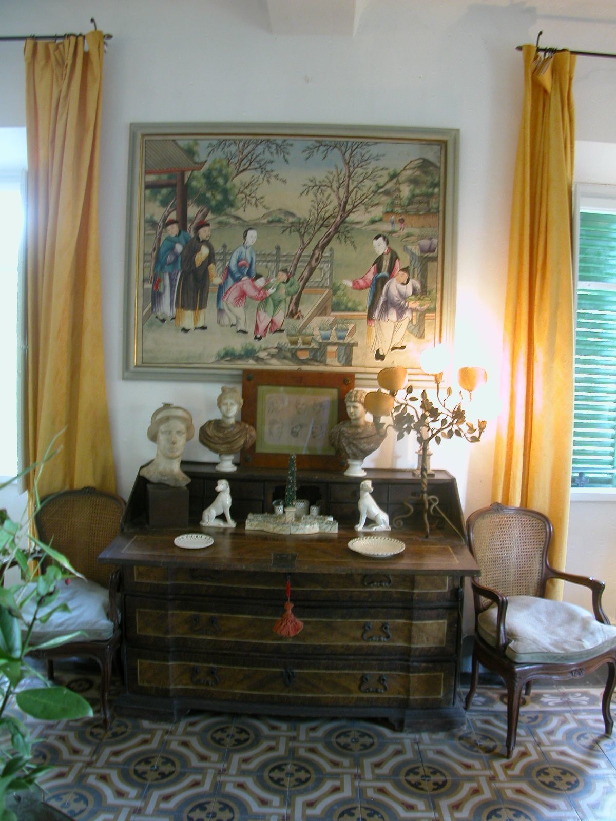 On the ground floor, the living room has a fire place and important antique pieces of the Family. The bright and spacious living room has direct access to the garden where there is a table for dining "al fresco".