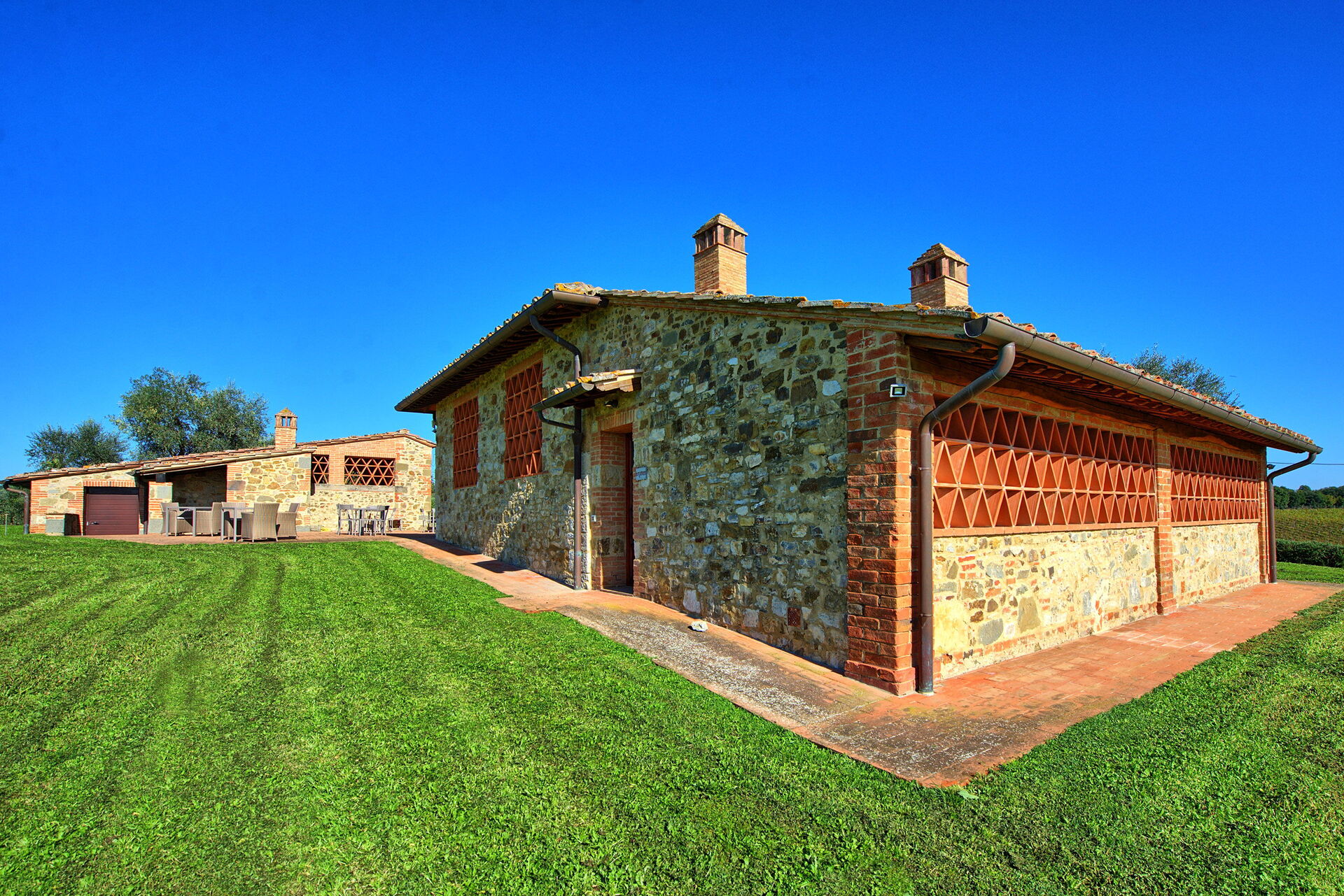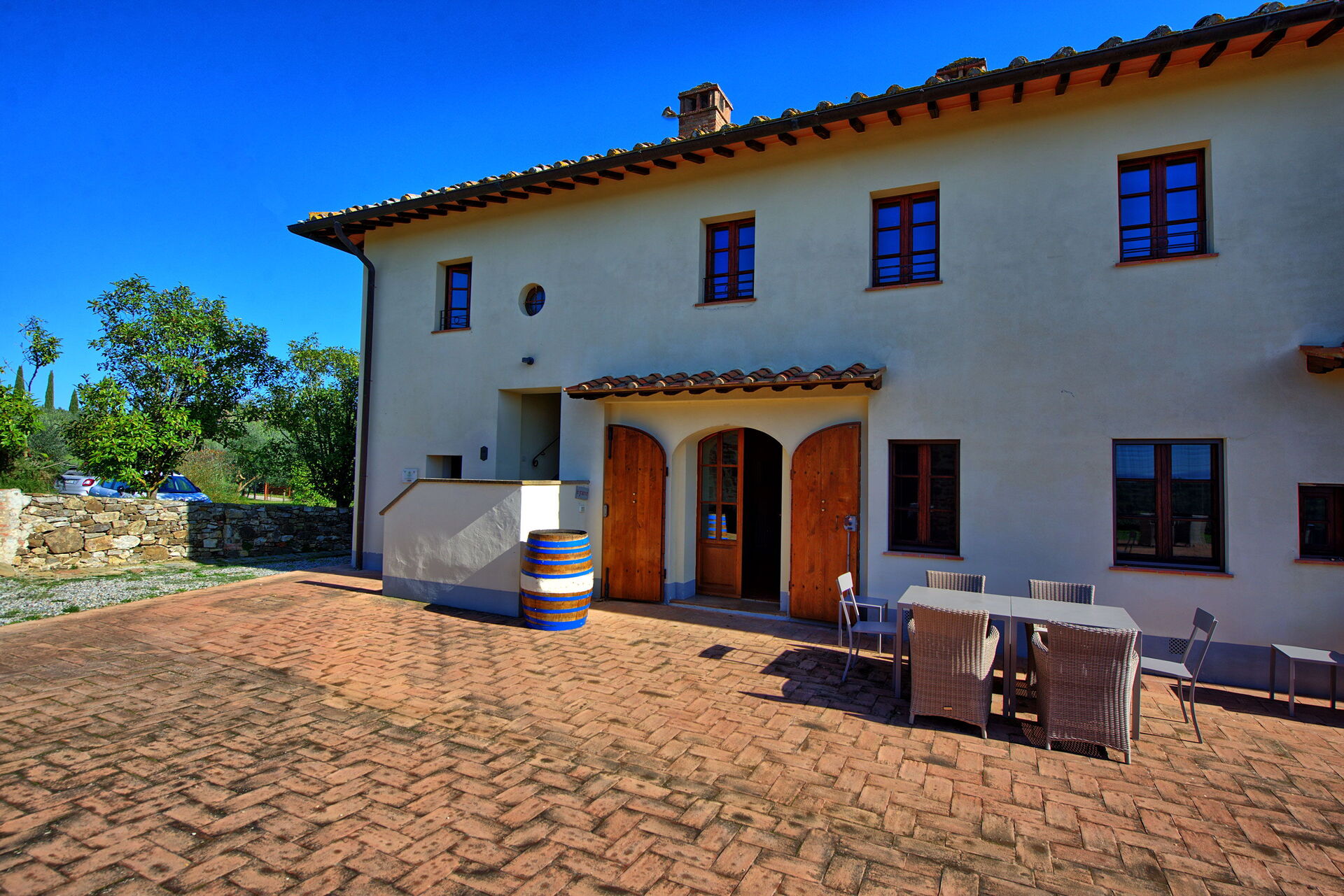 Ancient farmhouse with adjoining barn situated on a large and renowned farming estate producing excellent wine and olive oil. This property has been carefully restored and turned into 6 comfortable apartments, all of which offering nice interiors furnished in a rustic style with some antiques. The location, among vineyards and olive groves is peaceful and dominates the Chianti Classico hills. Beautiful panoramic views with Siena in the distance are afforded. This property provides a well-kept large garden (6000 m2) with infinity pool whose use is to be shared among the 6 apartments.