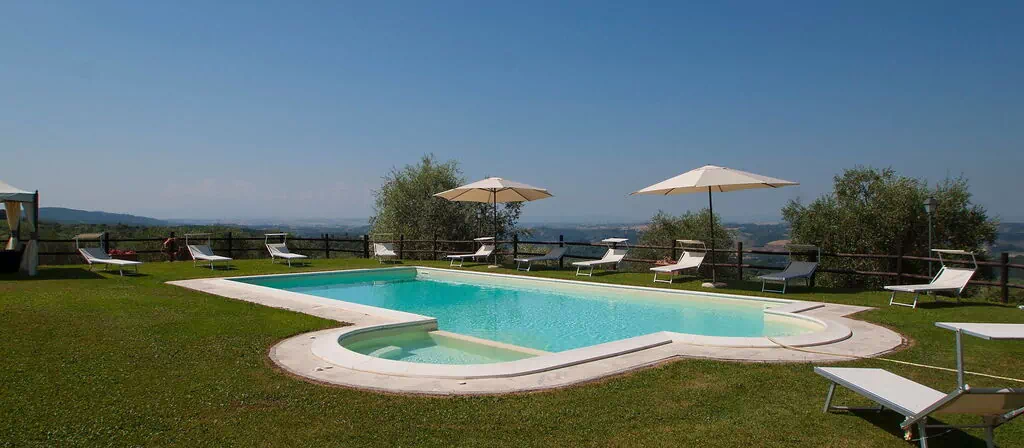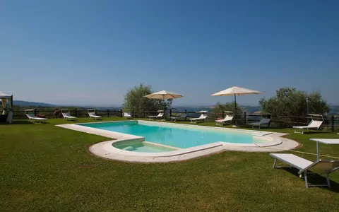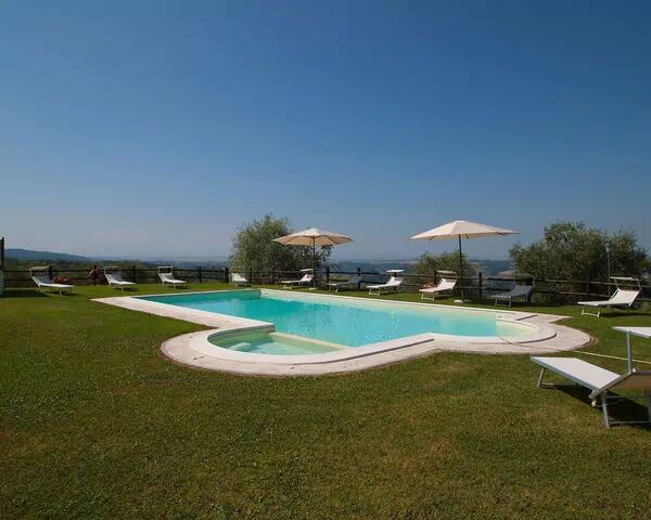 10 km from Rapolano Terme: The villa of Etruscan origin forms part of a large organic agricultural farm which produces wine and oil (2000 hectares). The building, surrounded by vineyards and olive groves in the middle of a large wood, is situated on a hill overlooking the valley and from where you can see Sienna. It is a property which guarantees absolute privacy and peace and quiet. The owner can arrange, tennis matches, guided tasting tours of local produce, cooking courses, wine and olive oil tasting. Babysitting. Rent Vespa and bicycles. Personal trainer. Agreement with hot water spring establishment (15 km). Private parking. Next to the swimming pool with hydromassage, where you can enjoy a magnificent view of the Sienna hills, is the relaxation area (jacuzzi and gym). Set bath robe and pool towels extra 10 Euro per person. The 8 bedrooms are on the ground floor and the first floor which can be reached via an exterior stone staircase or via the inside staircase from the lounge on the ground floor. Heating and air conditioning from a calor heater. Gazebo with table and armchairs, outdoor table with 14 chairs and table with 6 chairs. Villa "La Veduta". 17 km from the centre of Monte San Savino, 25 km from the centre of Siena, 80 km from the centre of Firenze, in a secluded, quiet, sunny position. Private: garden 250 m2 with lawn and trees, swimming pool fenced (6 x 12 m, depth 178 cm, 11.05.-30.09.). Outdoor shower, garden furniture, barbecue. In the house: internet access, WiFi, fitness room, whirlpool, air conditioning, washing machine, tumble dryer, heating to be paid on the spot (01.11.-15.04.). Linen change (suppl. charge extra). Room cleaning (extra). Cook on request (extra). Pre-arrival grocery service. 3 km long motor access (via unmade road). Parking at the house. Supermarket 10 km, restaurant 5 km, thermal baths "Rapolano Terme" 10 km. Golf course (9 hole) 25 km. Nearby attractions: Siena 25 km, Rapolano terme 10 km, Firenze 80 km. Please note: car recommended. Baby equipment. Groups of teenagers on request only. Suitable for events. The Villa is located in a remote area down long a countryside road (3 km) made of gravel and not paved (it is best to avoid driving low cars).