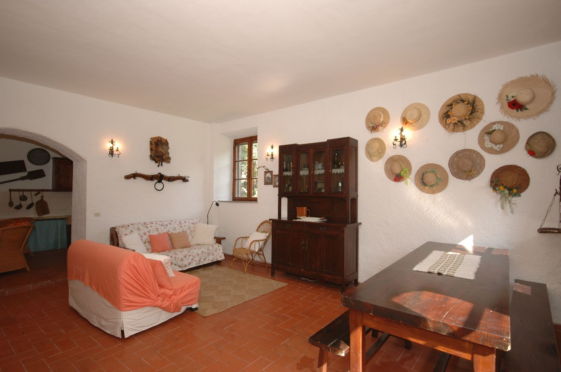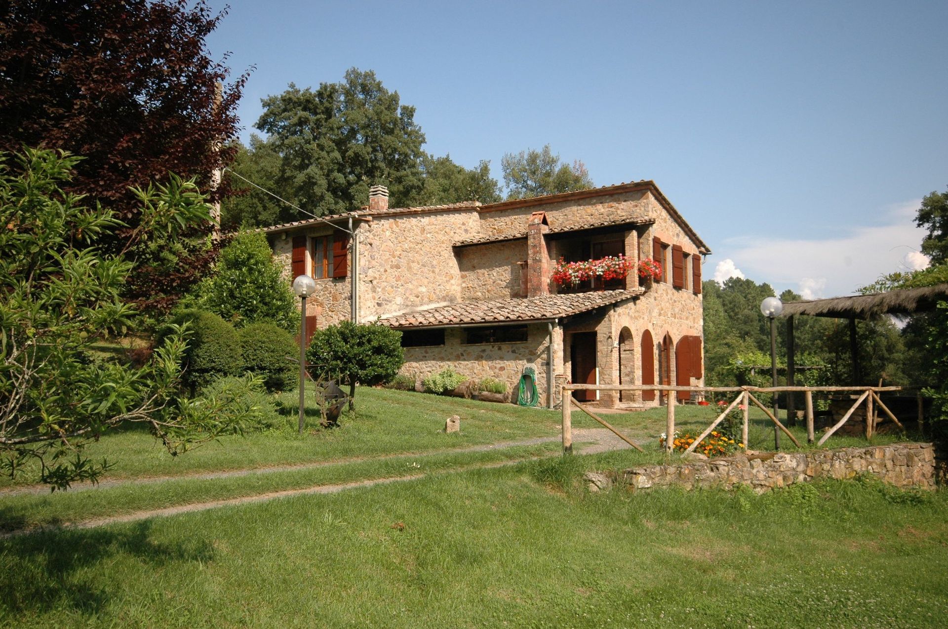 Large and beautiful farmhouse (220m2) located in a small wooded valley, in absolute tranquility and isolation. The house is located at the heart of 50 hectares of olive and cork trees, inside the Val di Farma Natural Reserve. Here it is easy to come across blackbirds, deer, wild boar and with a little luck, otters and foxes. Just 550m away from the house runs the the Farma river, where you can fish and swim in the various natural pools. View of the garden and the woods. The property’s location is ideal for a vacation in close contact with nature. The house offers a large, well-furnished and well-maintained lawn (5000 m2) that is enclosed and partly shaded. Outside there is also a beautiful, illuminated pool with outdoor shower, and a portico/porch/patio with a large table, chairs and old-fashioned wood-burning oven, perfect for dining al fresco. The furnishing is simple but comprehensive, in rustic style and in perfect harmony overall (the bathrooms are simple). Access to the property is via an unpaved, 2,4 km road that is not recommended for low-riding cars.
