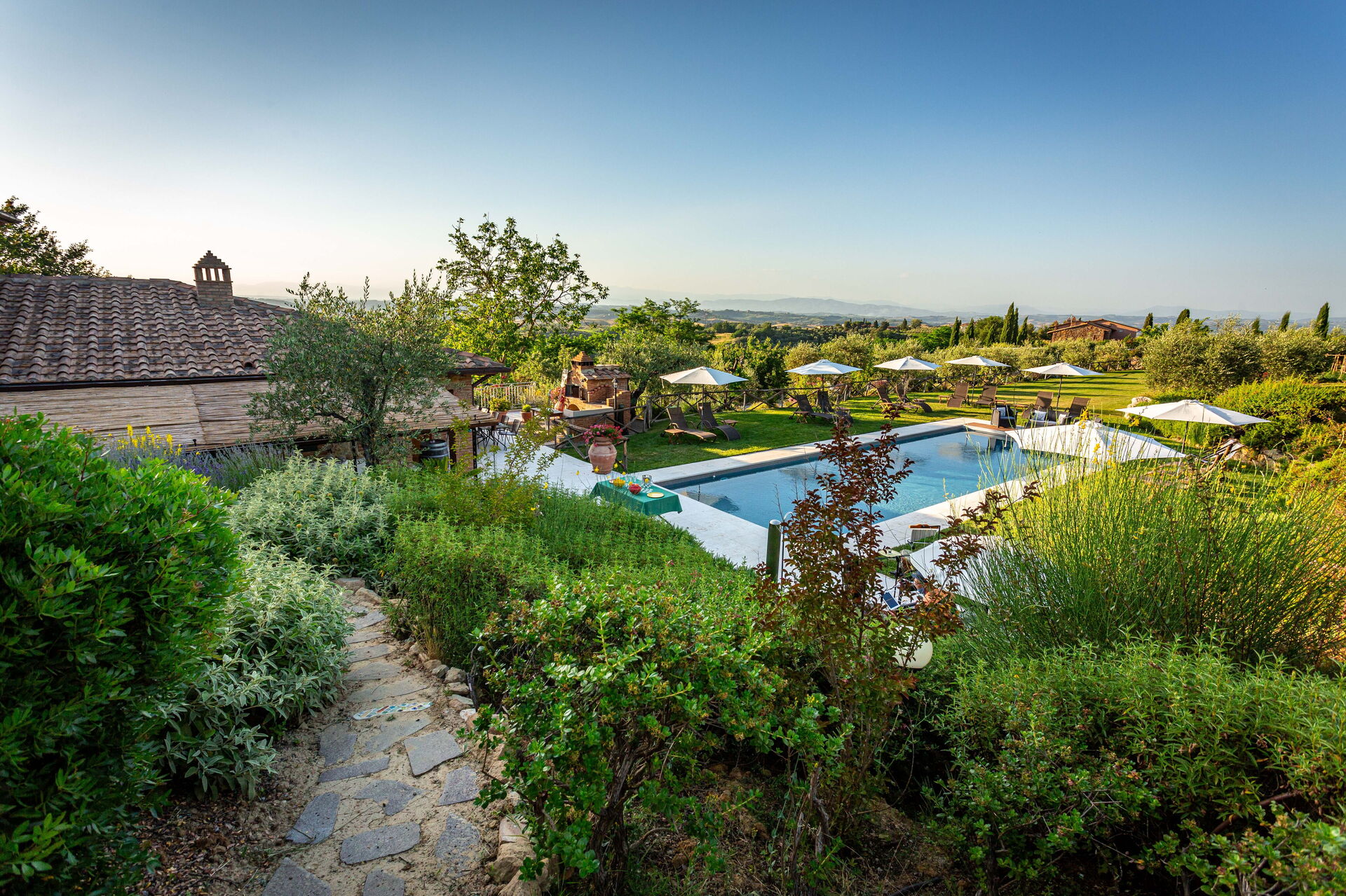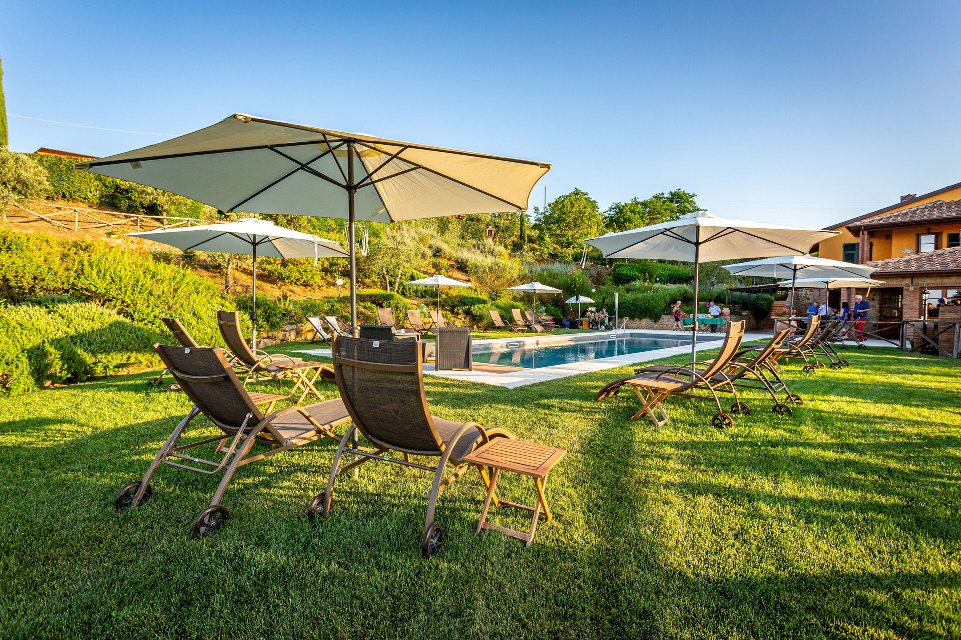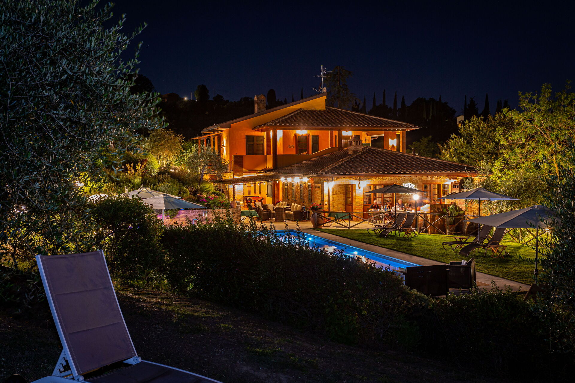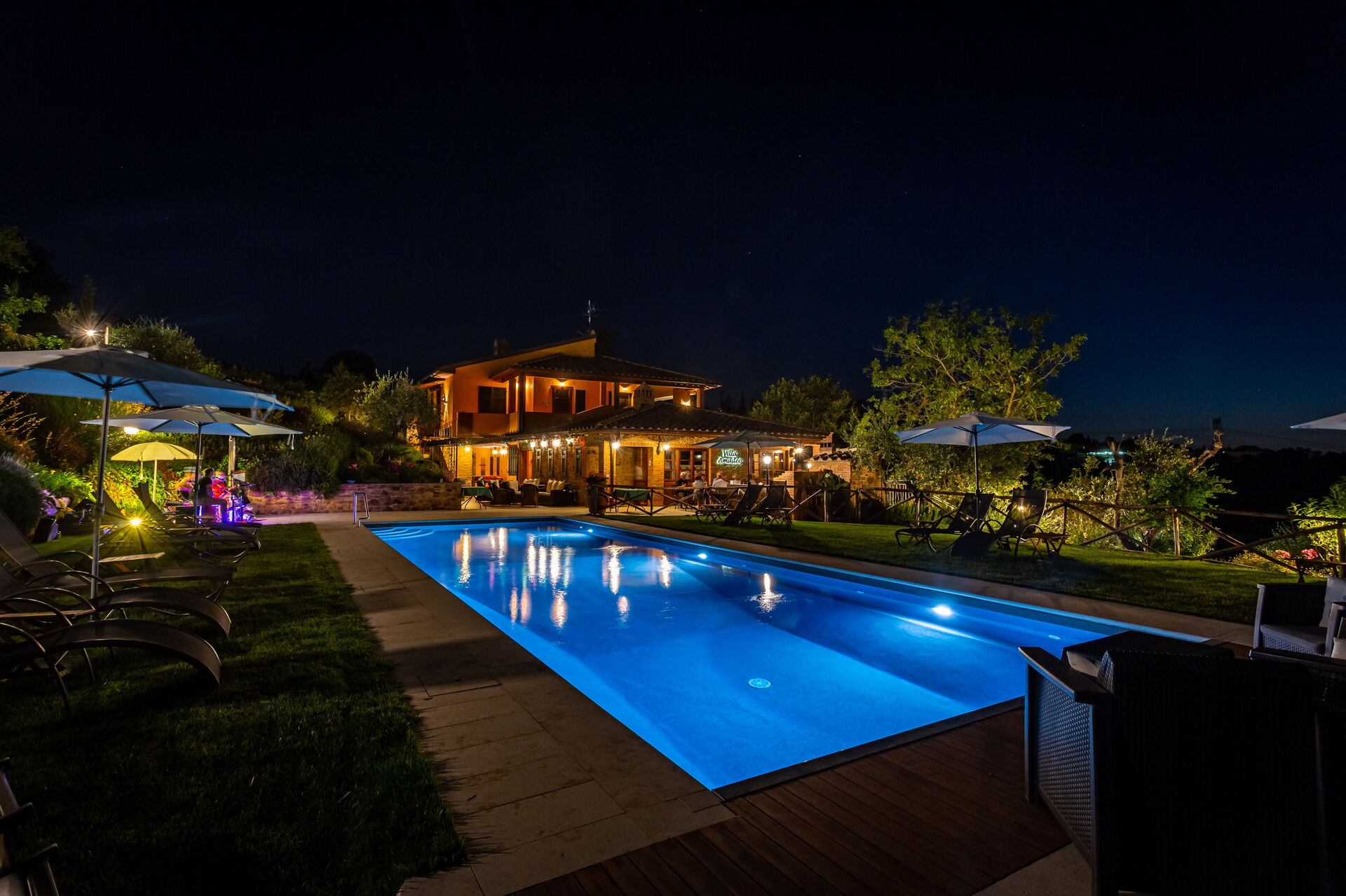 At guests’ disposal: large, equipped outdoor areas (sunbeds and umbrellas), panoramic swimming-pool (15 x 5 m – depth from 1,5 m to 2 m) with easy access, 6 air conditioned bedrooms each with private ensuite bathroom and furnished outdoor area; bathroom close to the pool; open-air shower, relax - zones; barbecue and pizza oven; vegetable garden, table tennis, badminton, billiard-table, children playground . Wi-fi Internet connection available, Satellite TV , washing machine; electric charging station; covered parking within the grounds.