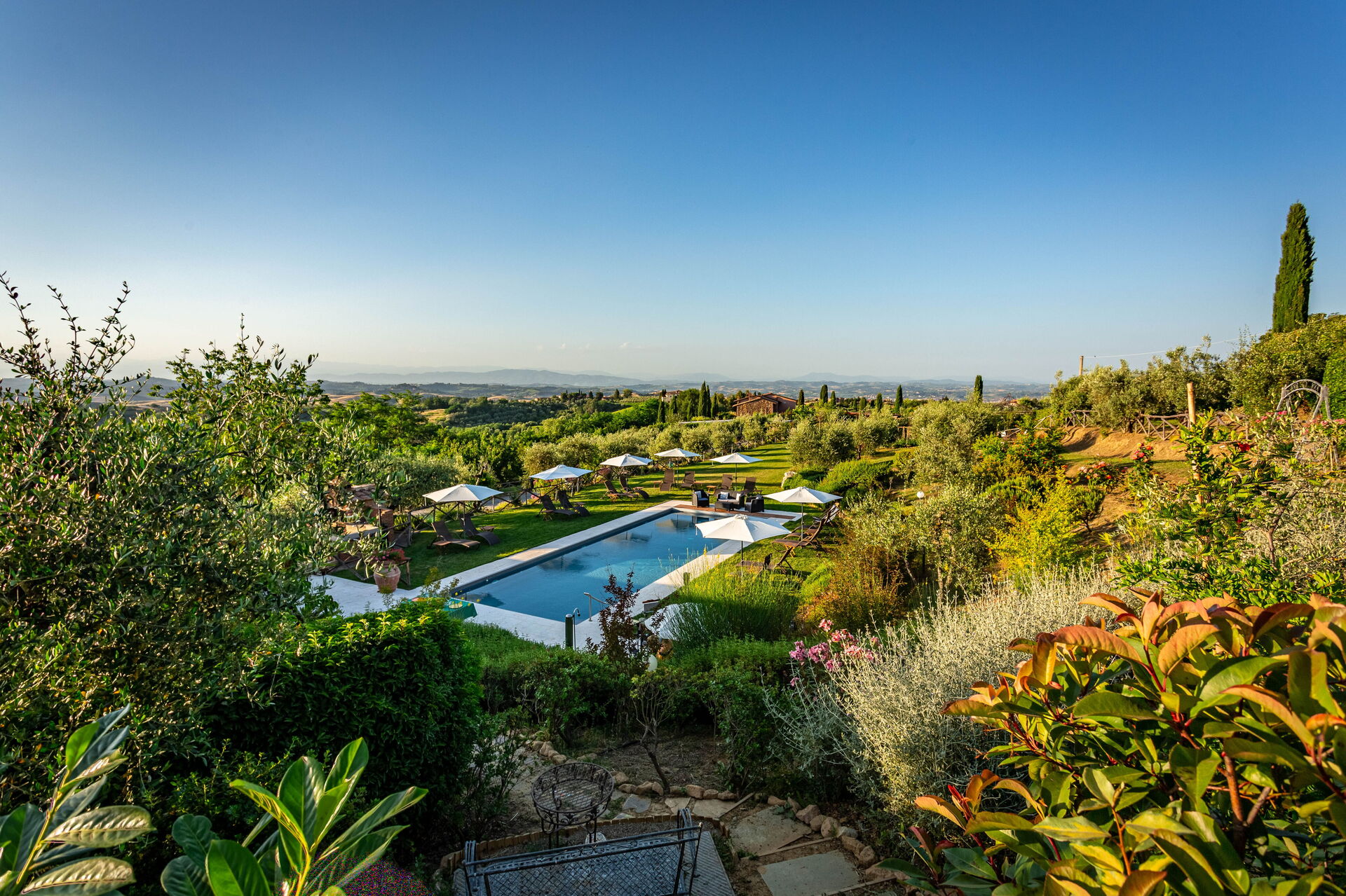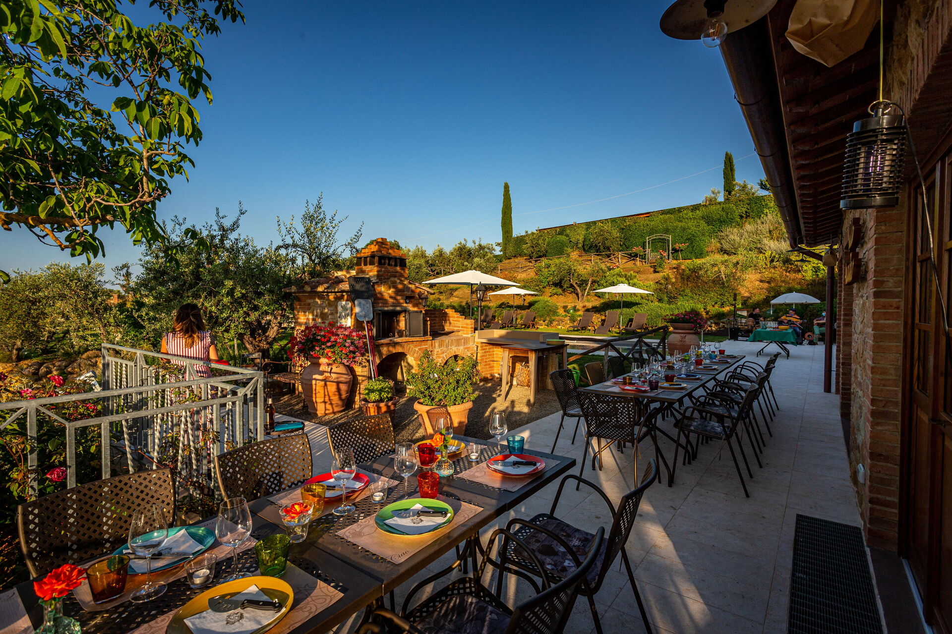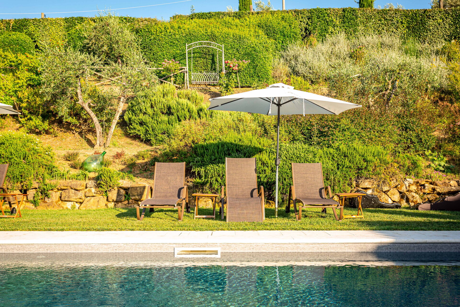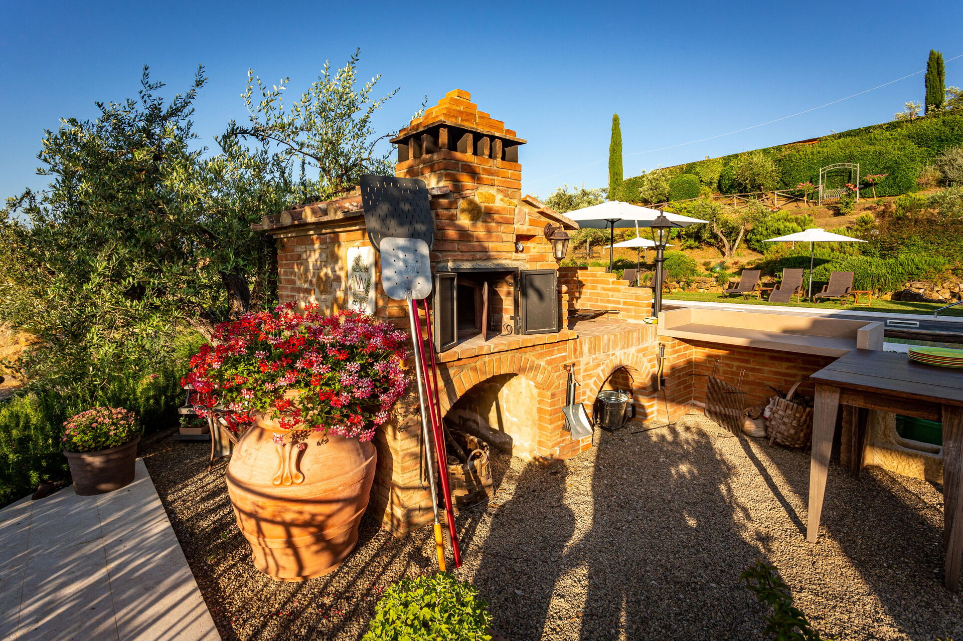 At guests’ disposal: large, equipped outdoor areas (sunbeds and umbrellas), panoramic swimming-pool (15 x 5 m – depth from 1,5 m to 2 m) with easy access, 6 air conditioned bedrooms each with private ensuite bathroom and furnished outdoor area; bathroom close to the pool; open-air shower, relax - zones; barbecue and pizza oven; vegetable garden, table tennis, badminton, billiard-table, children playground . Wi-fi Internet connection available, Satellite TV , washing machine; electric charging station; covered parking within the grounds.