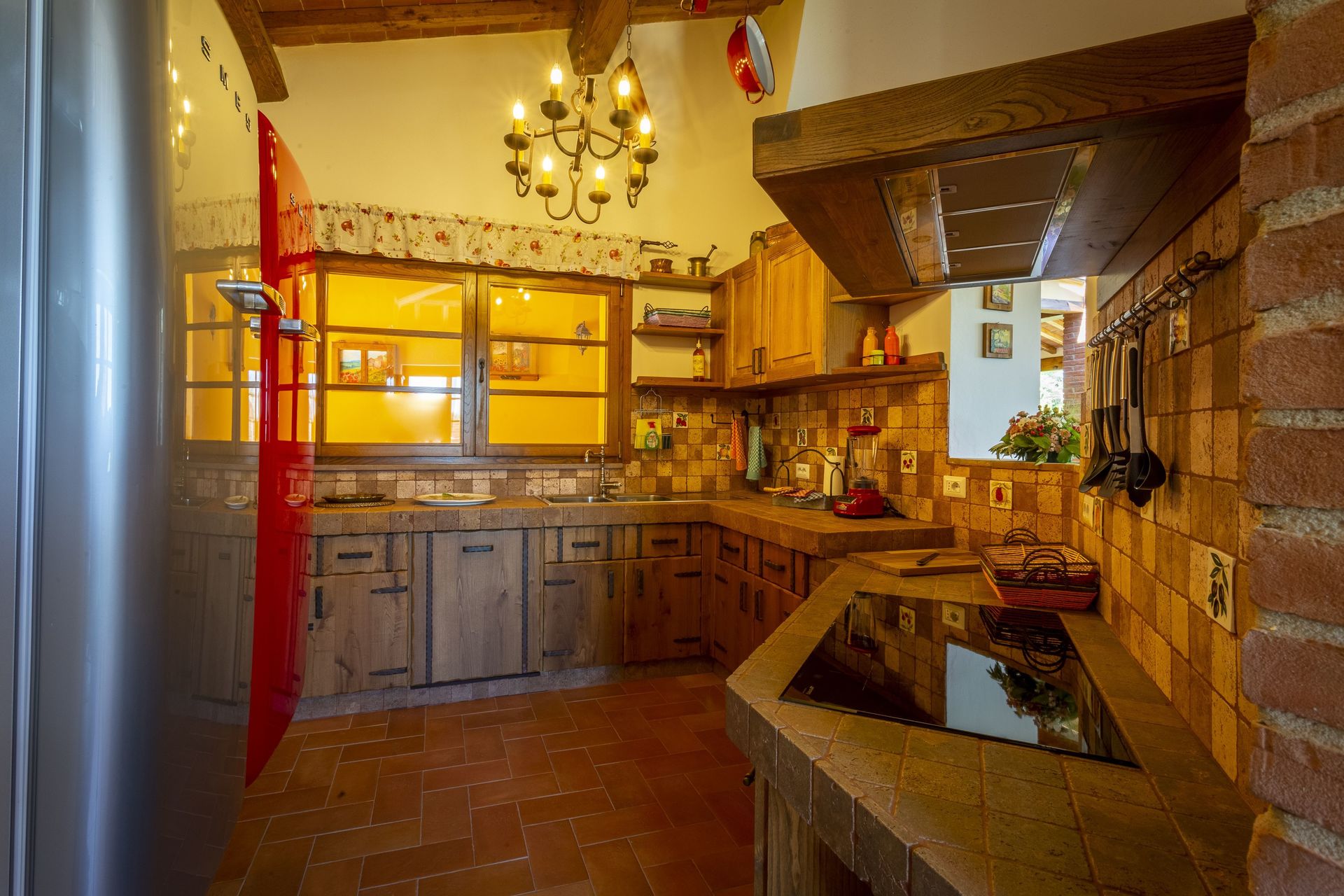 New "tavern" with cozy seating area with large fireplace, fully equipped kitchen (2 large refrigerators, freezer, dishwasher, large stove also suitable for cooking lessons, Nespresso coffe maker, kettle, toaster, blender, juicer), bathroom with shower.