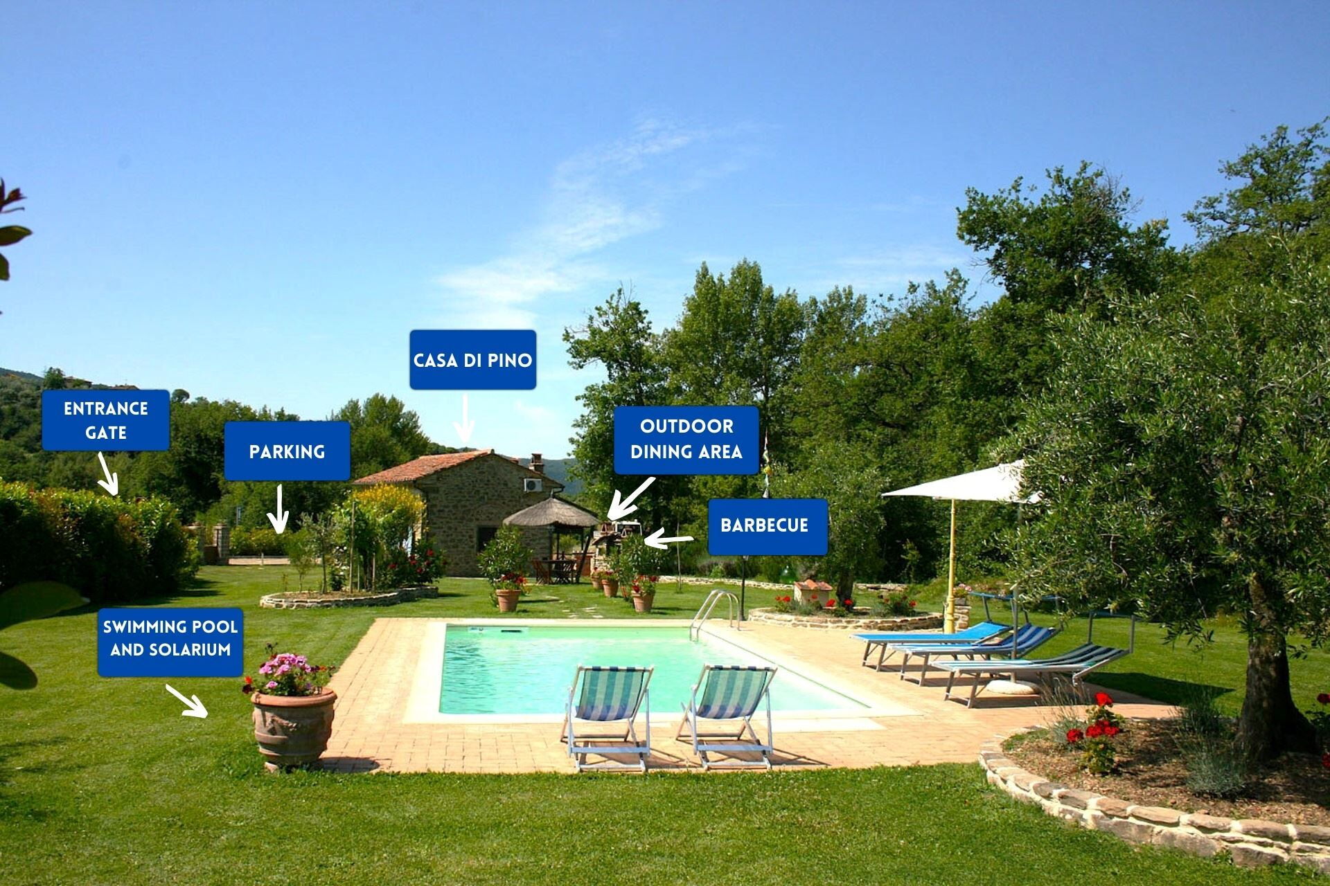 La Casa di Pino, a small jewel of rural architecture dating back to the year 1200, is located in the heart of the Val di Chio, on the border between Tuscany and Umbria and a few kilometers from the town of Castiglion Fiorentino. All around green woods that are part of the farm, where you can also admire the beautiful 'Majesty' in the grove, a few hundred meters from the house.