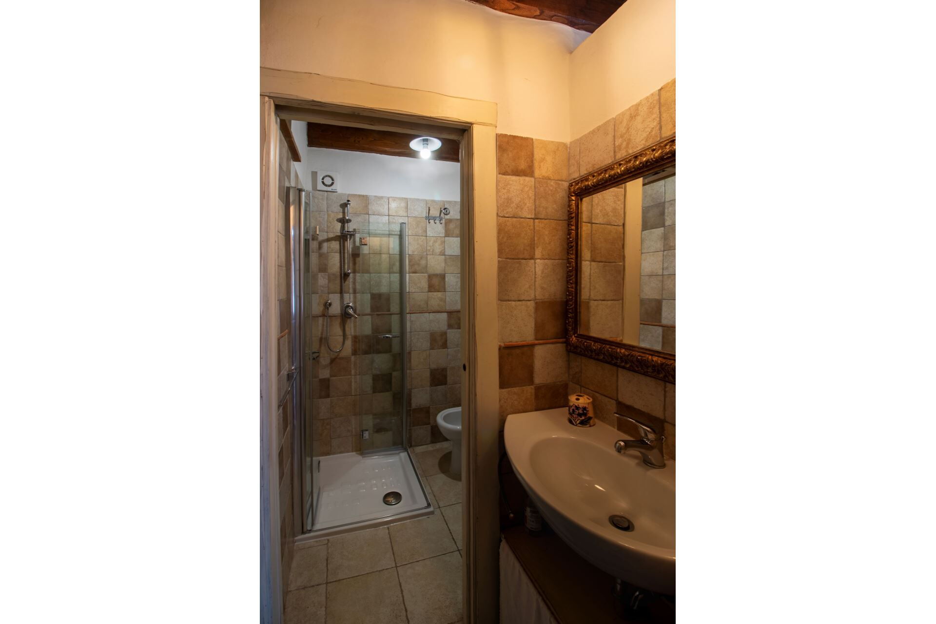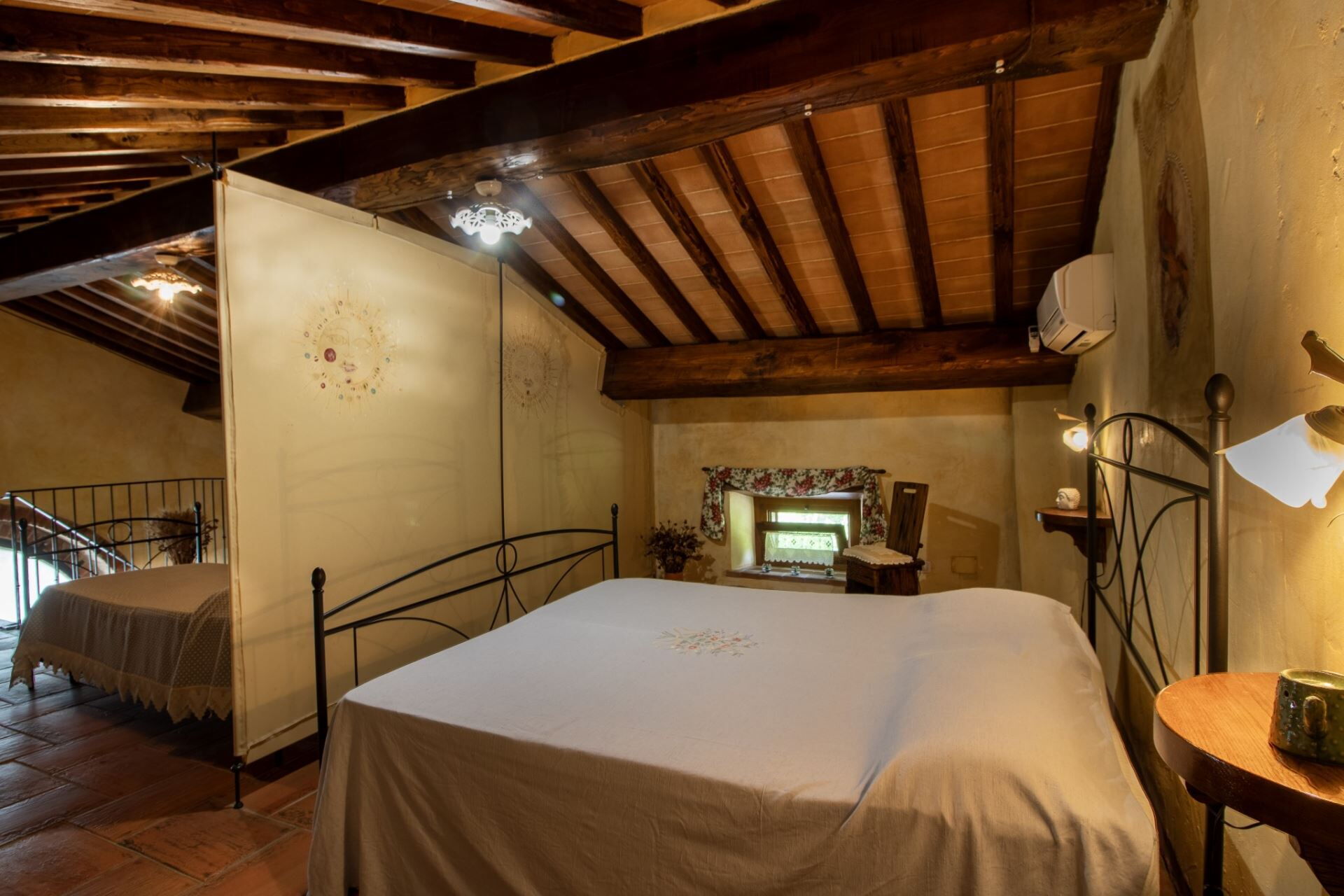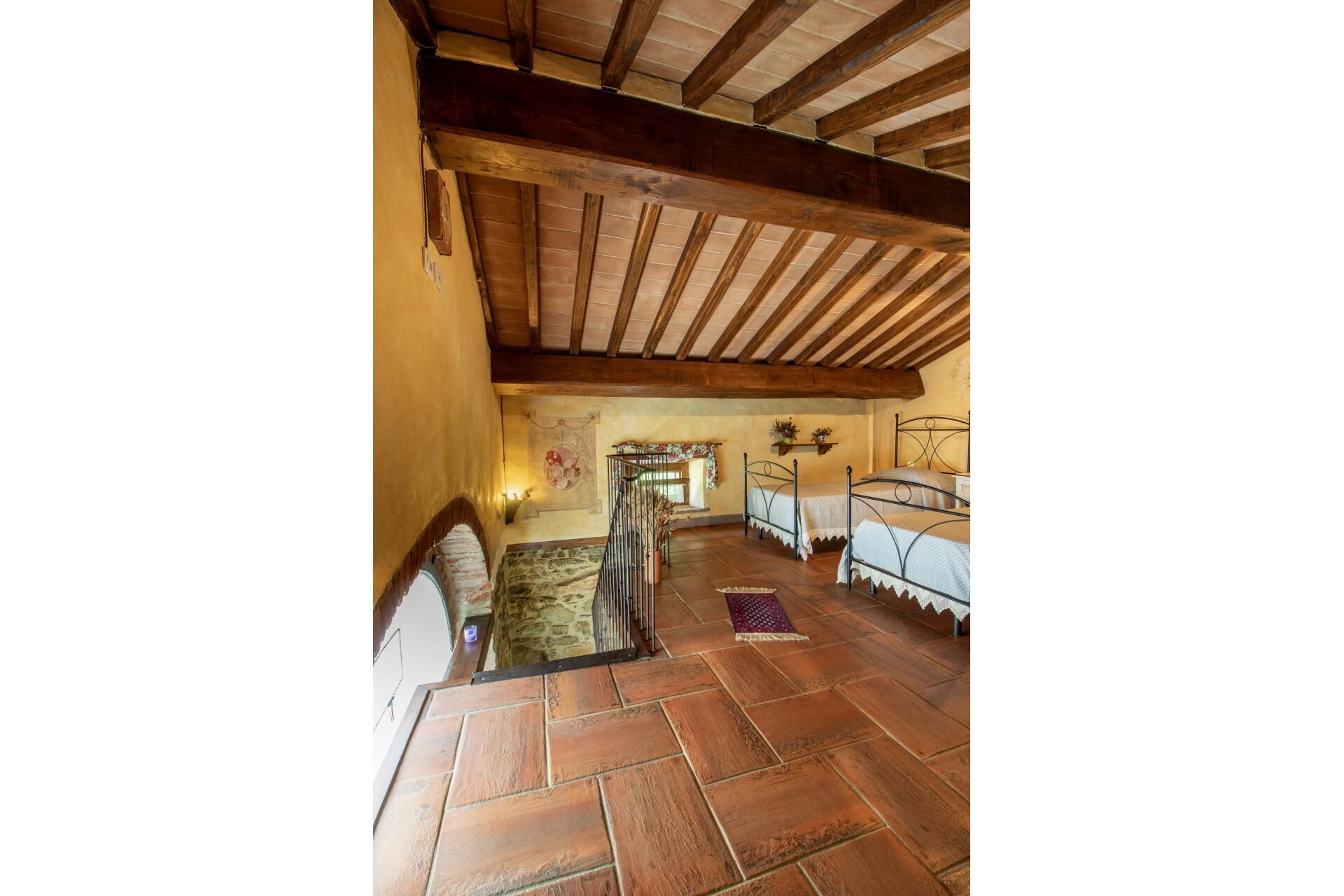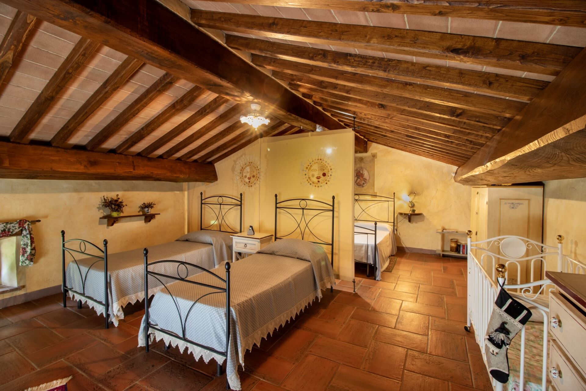 First Floor: with access through internal stone and wrought iron staircase, wide room with terra-cotta floors and characteristic ceiling with wood beams where there are a double bed and two single beds divided by a room divider.