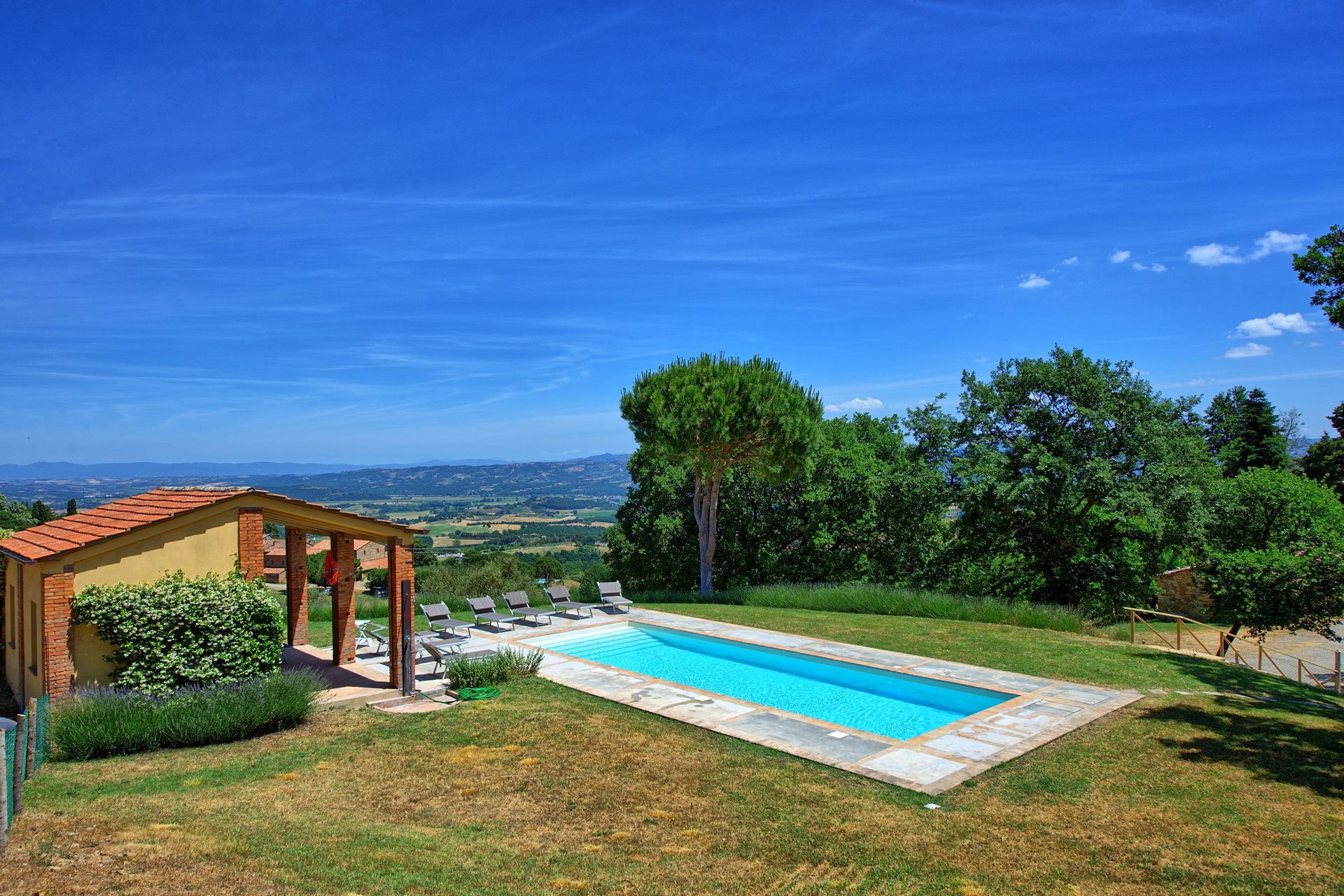 The private swimming pool is set in an elevated position, providing panoramic views over the valley.