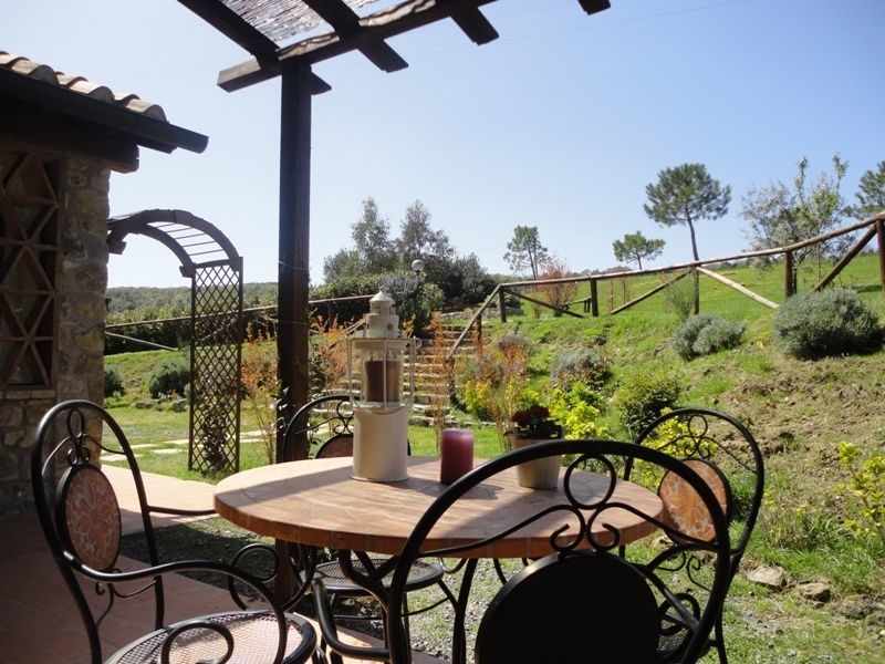 Private terrace enjoying pleasant view and furnished with table and chairs.