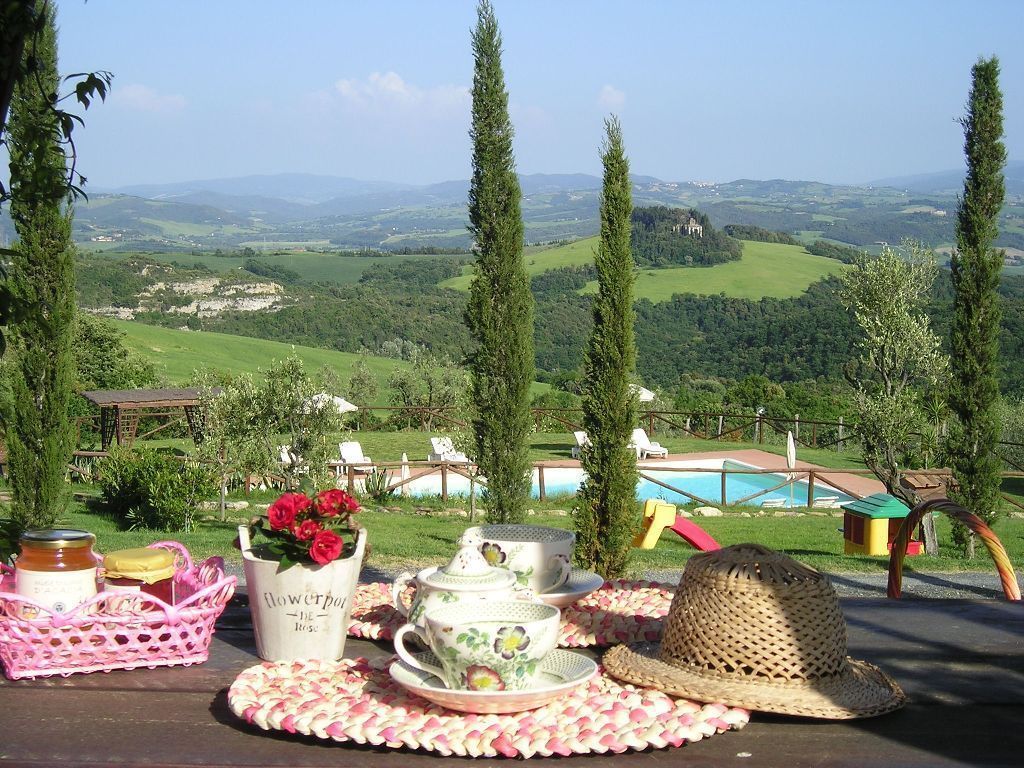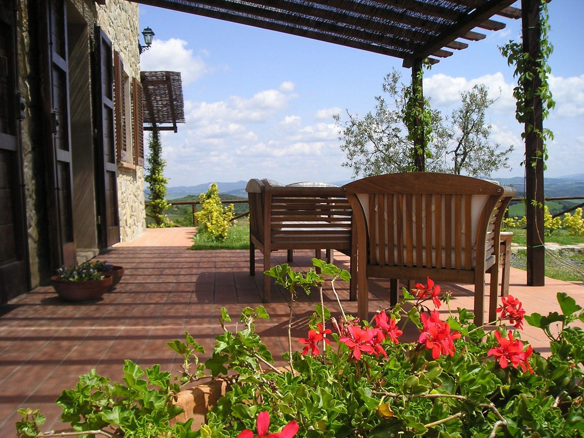 Private terrace with pergola enjoying a pleasant view and furnished with table and chairs.