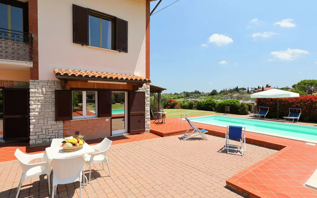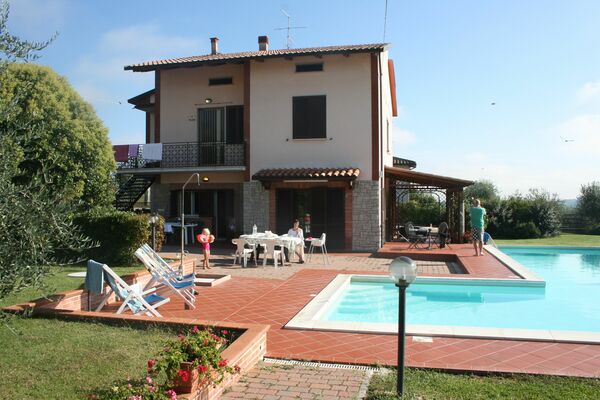 Comfortable villa "Giardino degli Ulivi". 7 km from the centre of Castiglione del Lago, 20 km from the centre of Montepulciano, 20 km from the centre of Cortona, in a sunny position, 7 km from the lake, located by a road. Private: large garden 3'500 m2 (fenced), swimming pool angular (12 x 8 m, depth 120 - 160 cm, 07.05.-25.09.). Outdoor shower, table tennis, boules, pergola, garden furniture, barbecue, barbecue house, children's playground (slide, swing). In the house: WiFi, storage room for bicycles, washing machine. Available: bicycles (2). Roofed, parking on the premises. Grocery 1 km, supermarket 7 km, restaurant 1 km, railway station "Terontola" 13 km, ferry "Isole Del Trasimeno" 7 km, thermal baths "Chianciano Terme" 21 km, bathing lake "Trasimeno" 7 km. Nearby attractions: Passignano Sul Trasimeno 22 km, Sarteano 23 km, Cetona 25 km, Città Della Pieve 30 km, Pienza 30 km, San Qurico D'orcia 40 km. In the property garden there is an annex equipped with professional kitchen and space where events can be held on request.