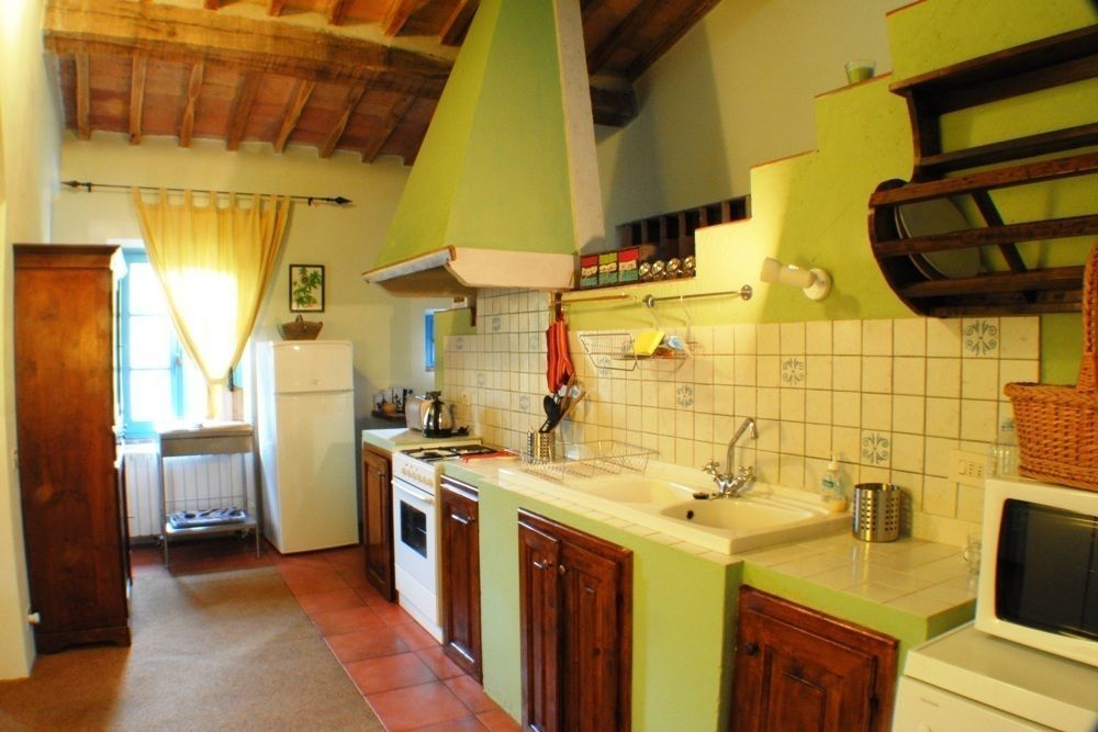 The kitchen is in traditional Tuscan farmhouse style and is equipped with dishwasher, cooker, oven, microwave, fridge, toaster, kettle, coffee maker, cooking utensils, crockery and cutlery.