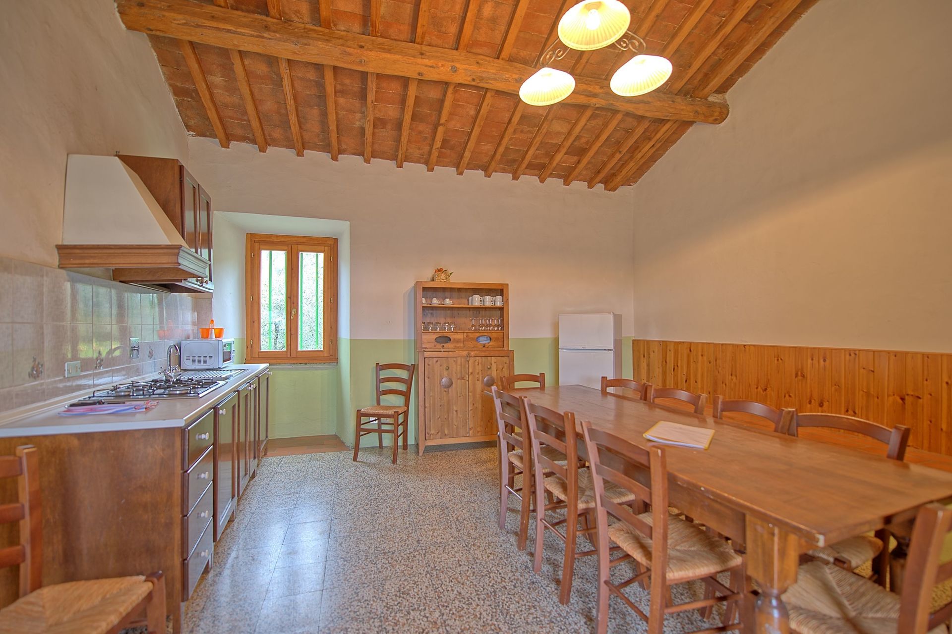 Ground floor: kitchen (freezer, small microwaves/electrical oven) with dining table.