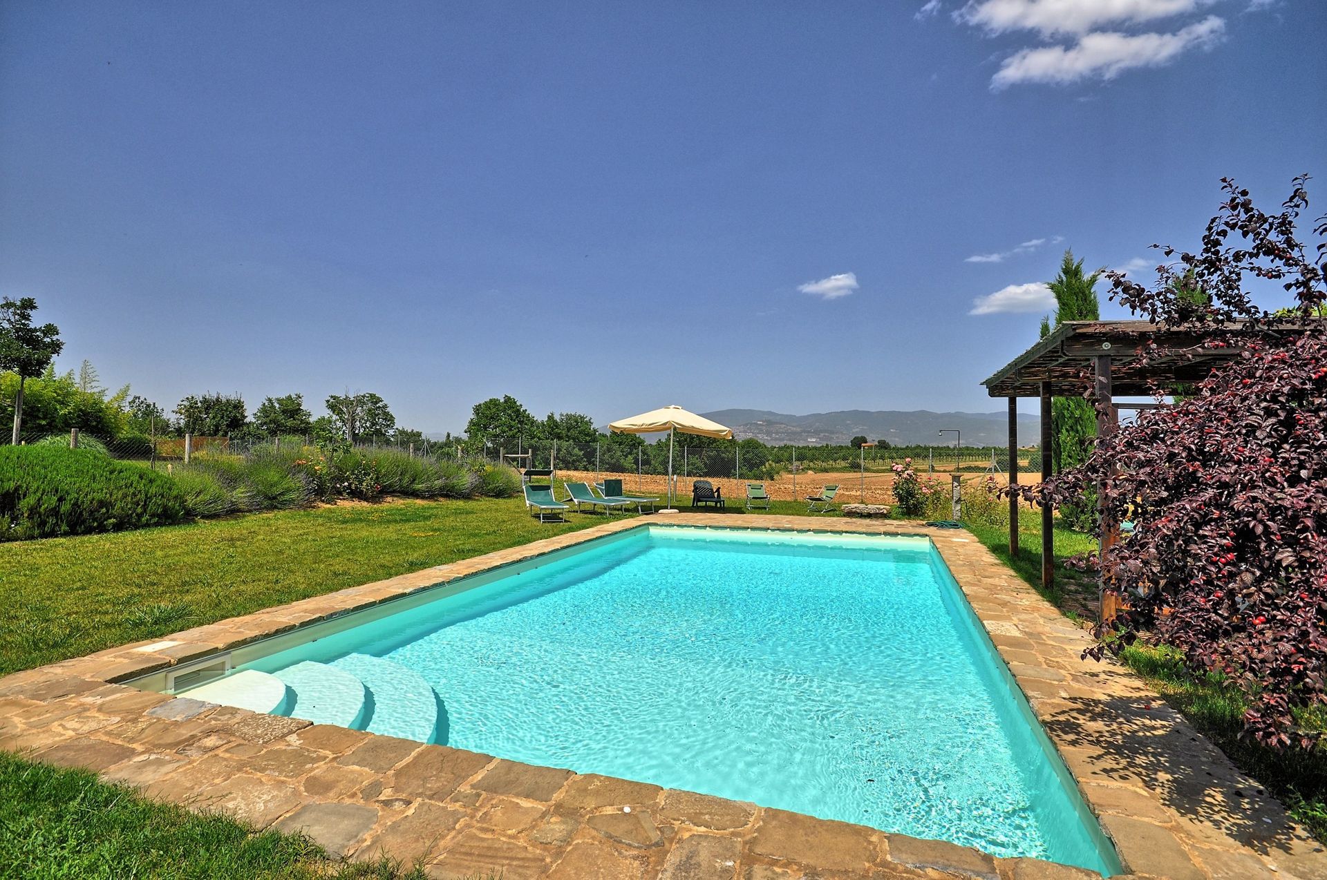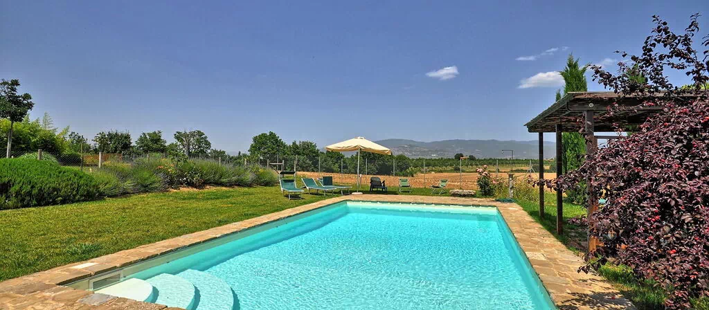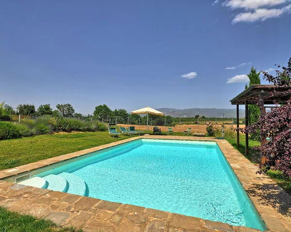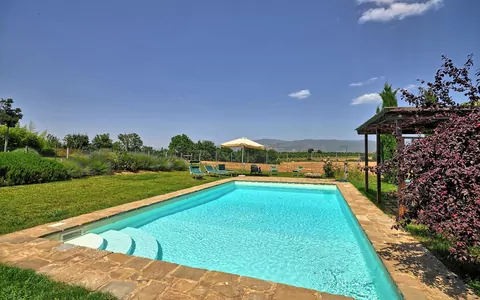 Beautiful independent villa with private pool situated a short distance away from the charming town of Cortona. This villa, dating back to the 19th century, has been recently restored and turned into a welcoming country house offering tastefully furnished interiors. The location is quiet and panoramic with extensive views over the surrounding landscape. Outside guests may use a nice well-groomed garden, a beautiful private swimming-pool, a solarium area and a covered terrace. This property is entirely fenced-in and the pool area is surrounded by an additional enclosure.