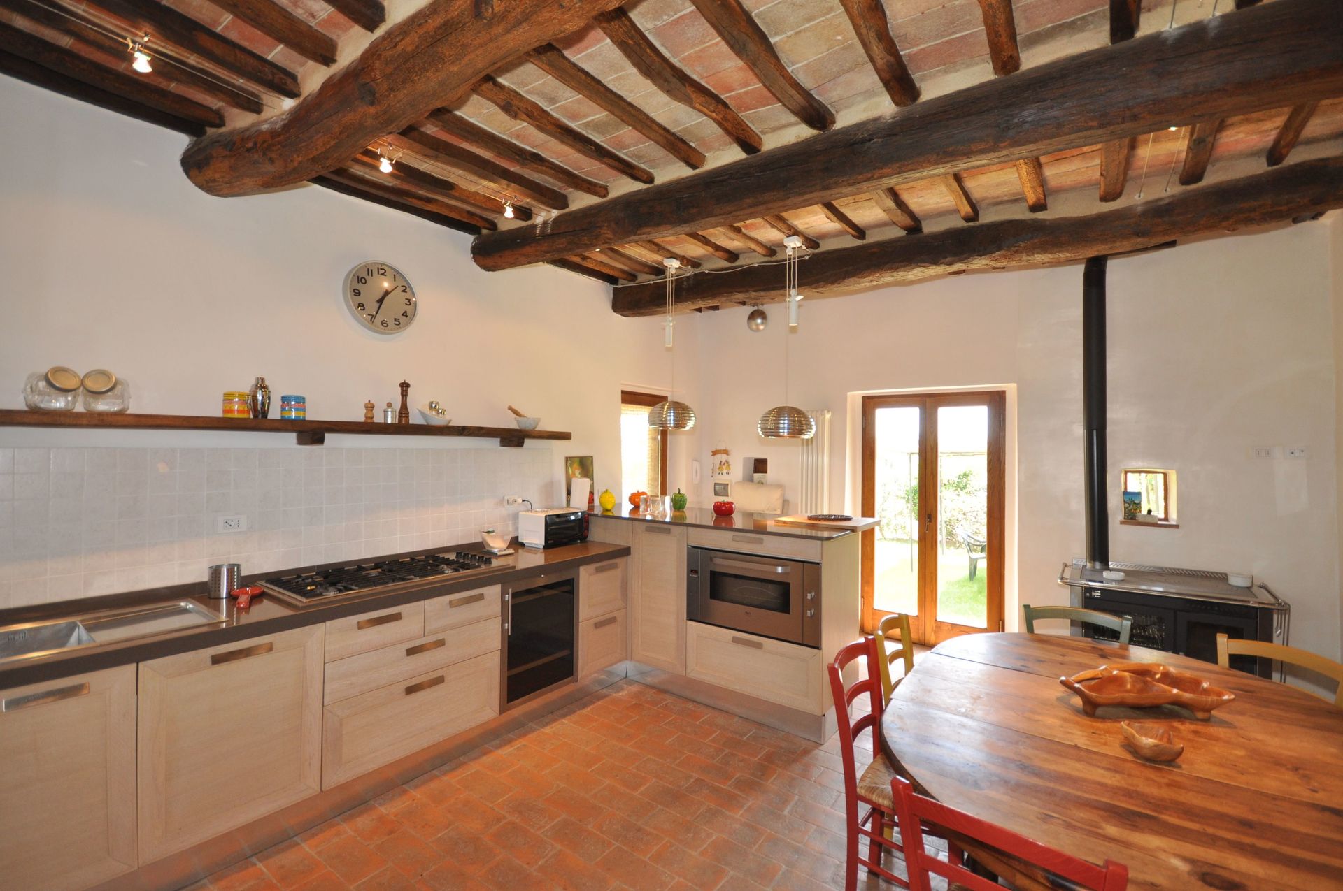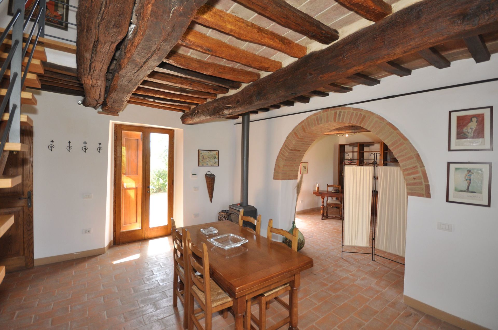 Ground floor: living-room with wooden stove, dining area and double sofa-bed.