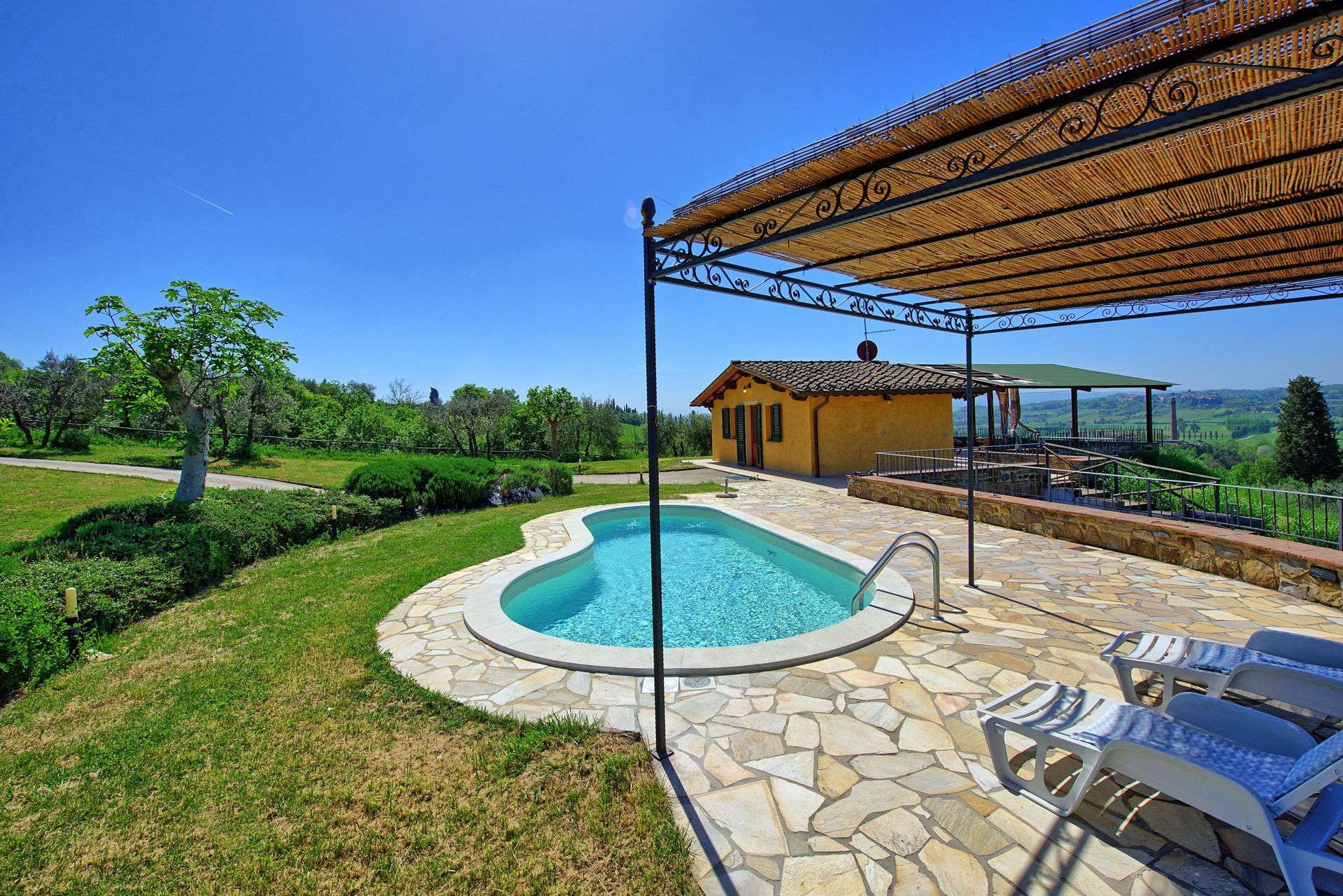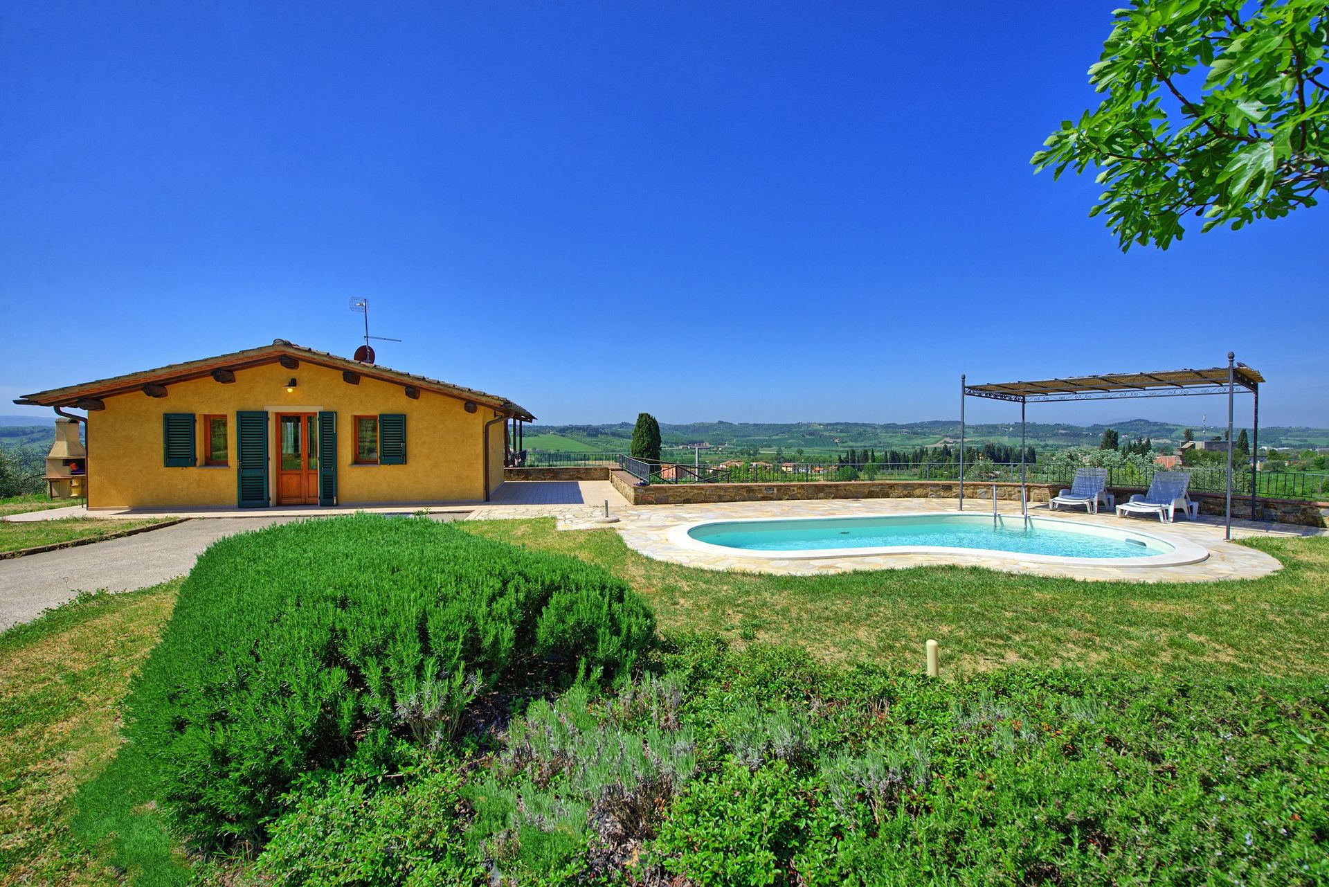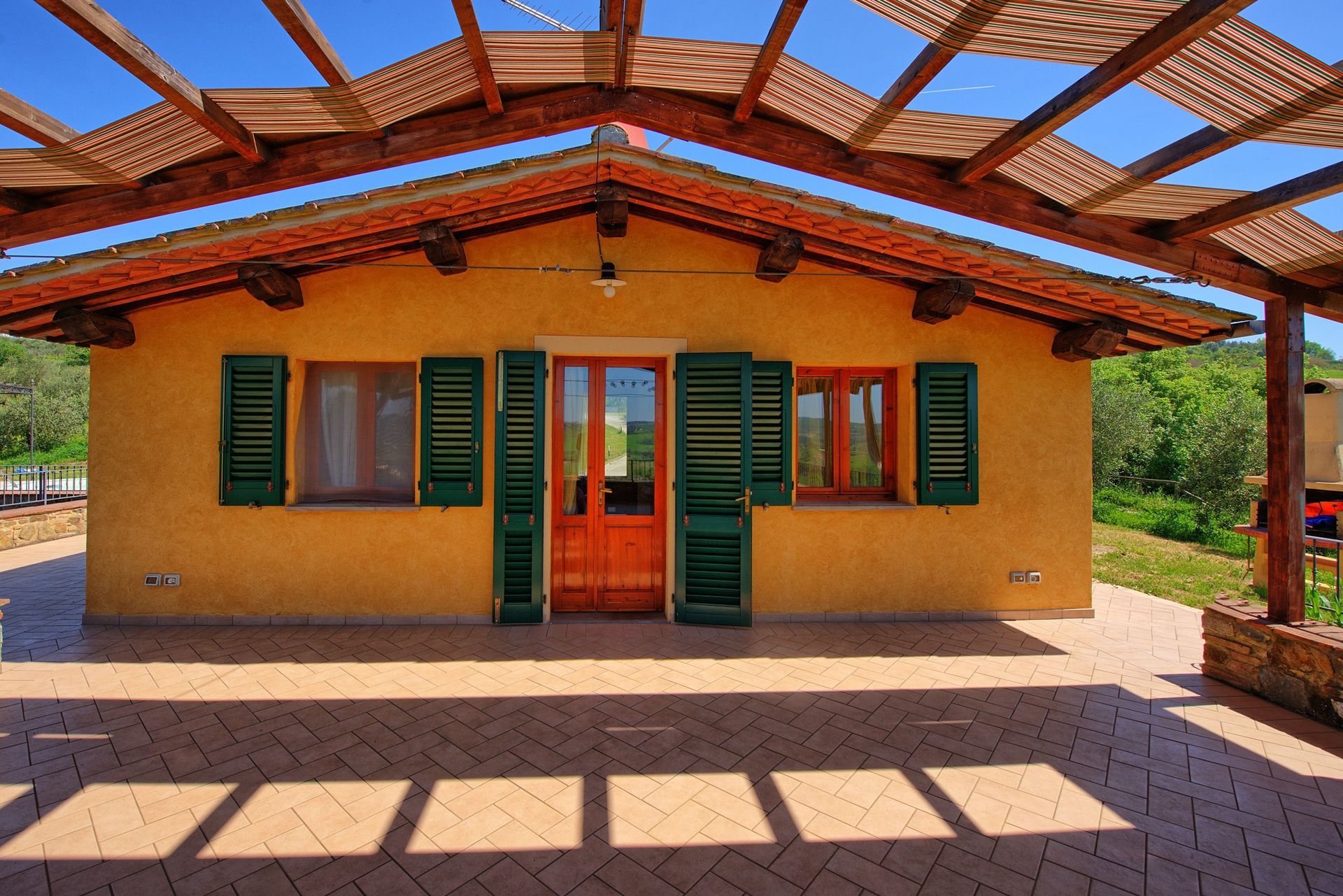 At guests’ disposal: furnished garden with private bean-shaped swimming-pool (7 x 3 m circa – depth 1,2 m – open from 01/04 to 30/10), barbecue, large furnished terrace with gazebo ideal for al-fresco dining offering extensive panoramic views over the surrounding landscape.