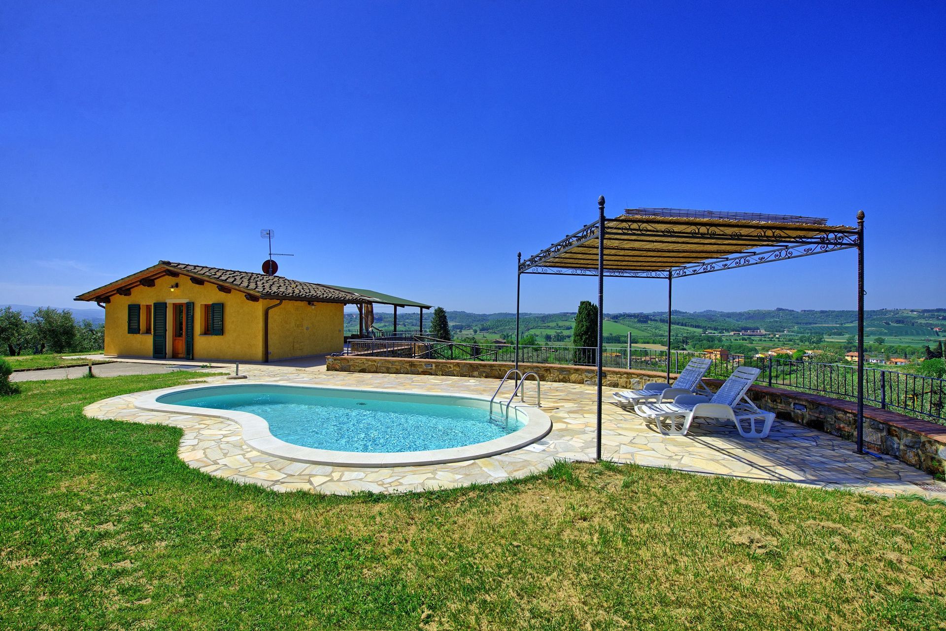 Charming small independent villa with private pool situated on the hills surrounding the small town of Cambiano, approx. 45 km from Florence. This villa offers nice outdoor areas with a beautiful panoramic terrace, gazebo, furnished garden and private pool. The interiors are welcoming and provide air-conditioning.