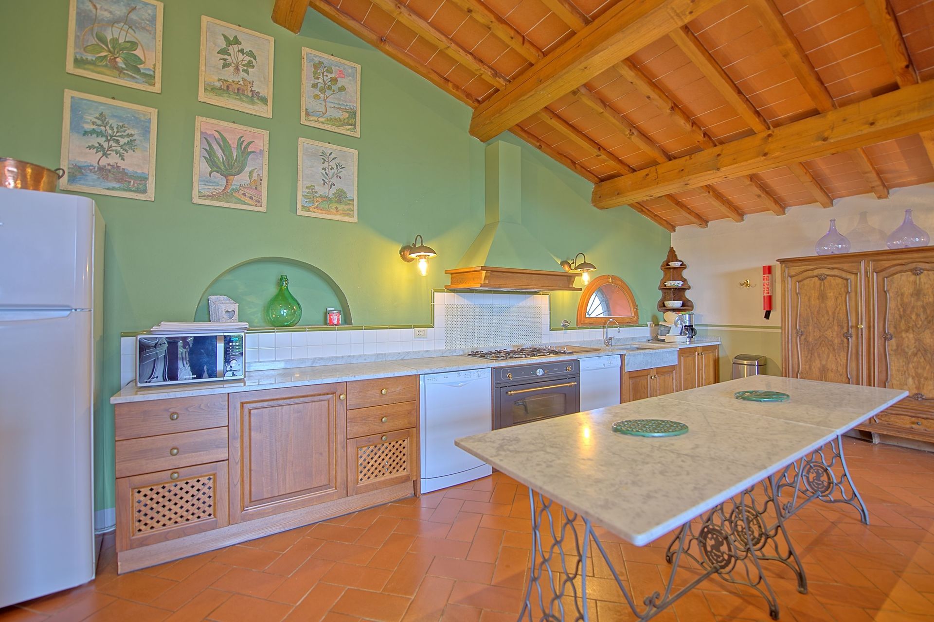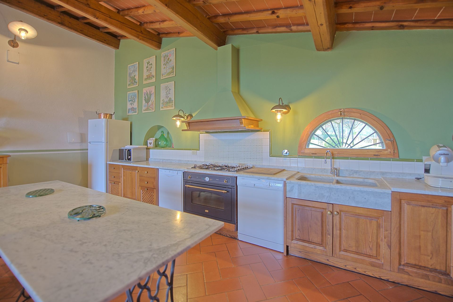 Ground floor: large living-room with dining area and kitchen corner (oven, 2 dishwashers, freezer, toaster, American coffee maker, boiler)