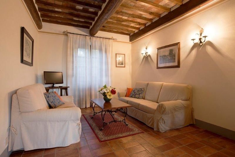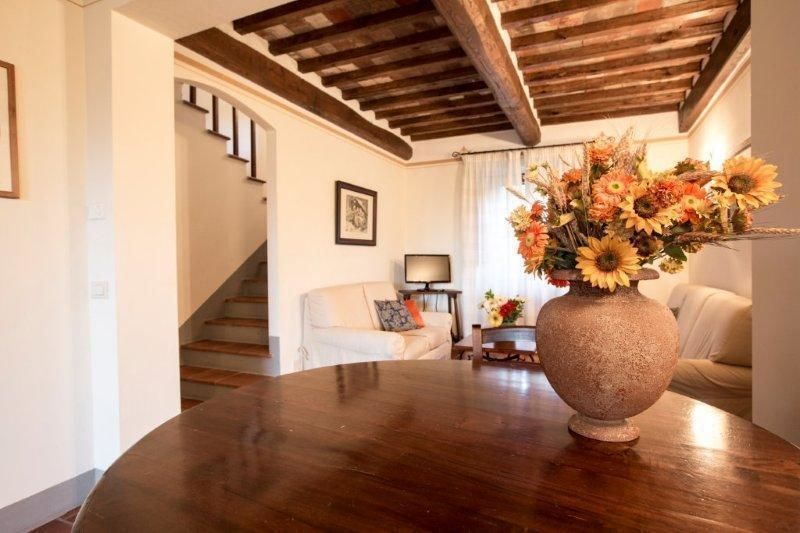 First floor: 1 double bedroom, 1 bedroom with twin bed convertible into double, bathroom with shower, view of Val di Chiana,