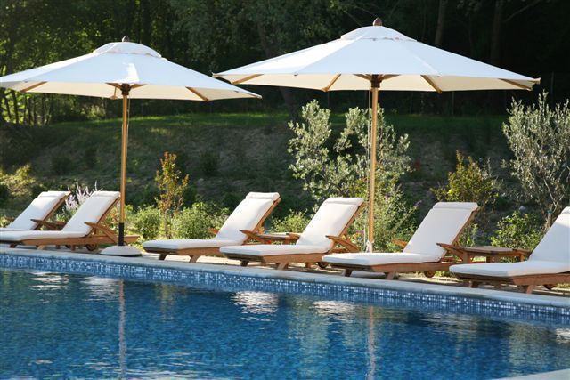 A particularly inviting feature of the villa is the sparkling blue swimming pool. Attractive large and well-positioned, it is surrounded by lounge chairs shaded by umbrellas. In this spot one can also enjoy a candle-lit dinner, in the midst of the greenery and flowers, while taking in the sunset and being serenaded by humming cicadas..