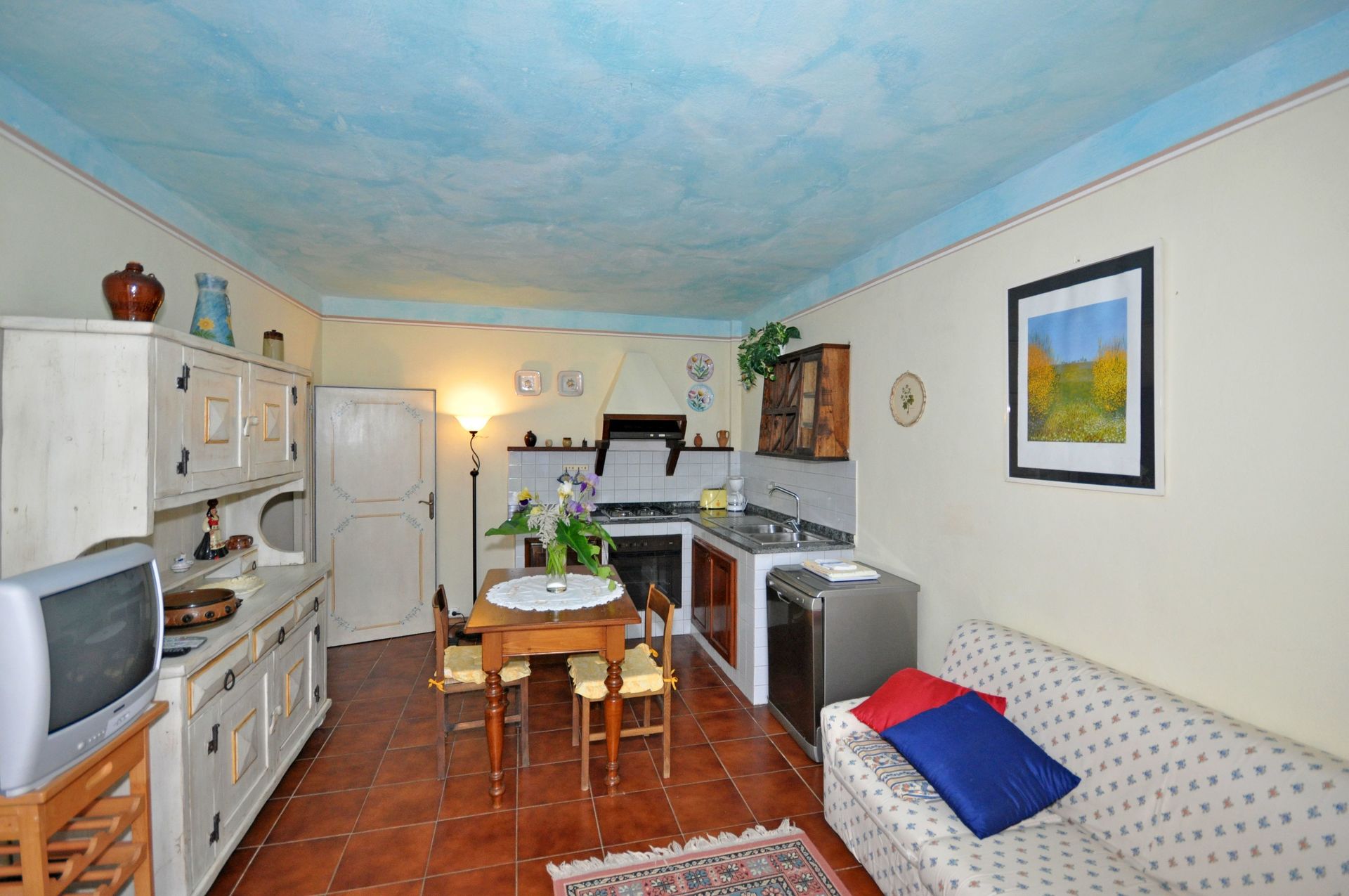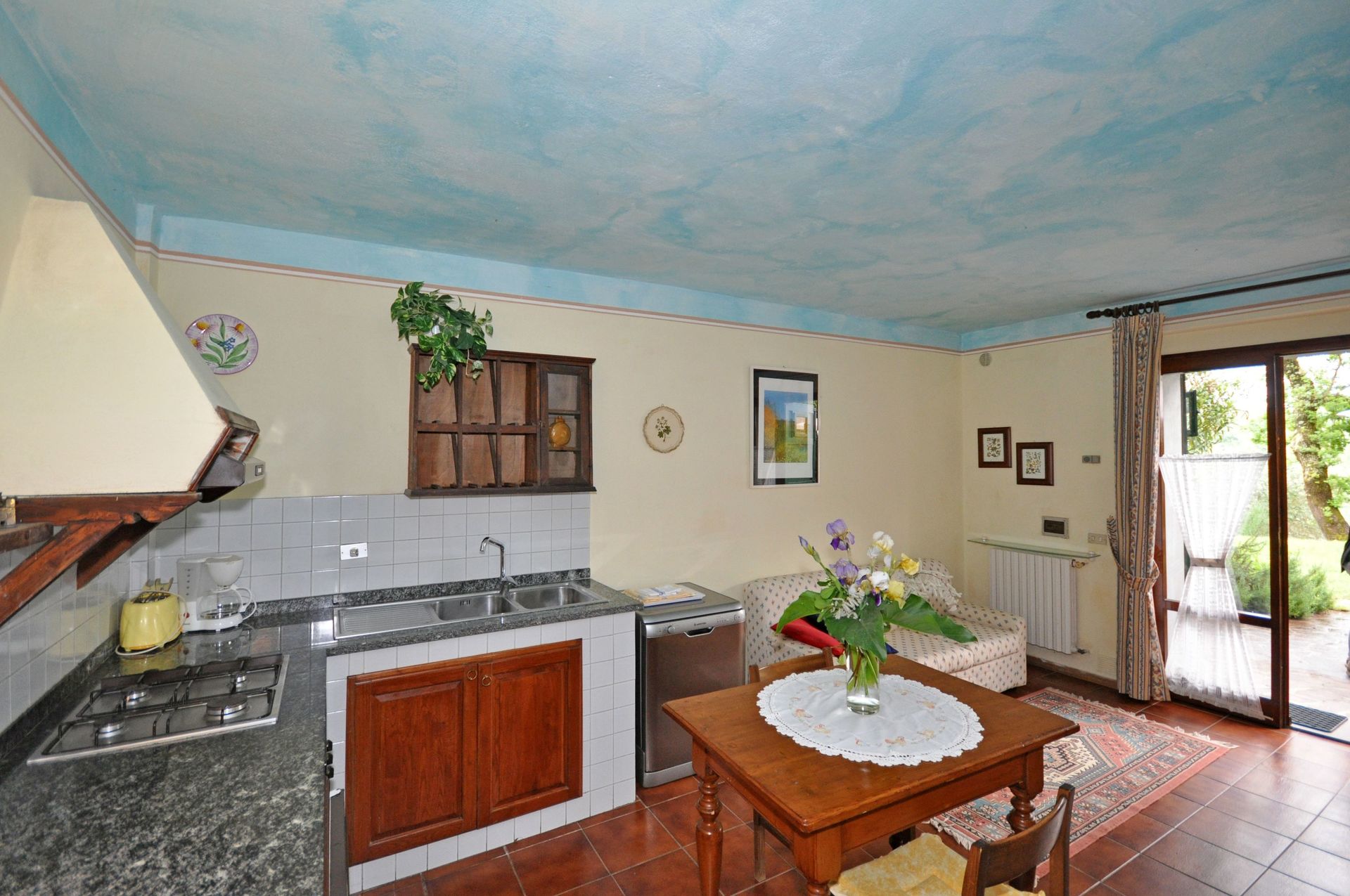 Ground floor: living-room with dining area and kitchen corner (oven, dishwasher), double bedroom, bathroom with shower.