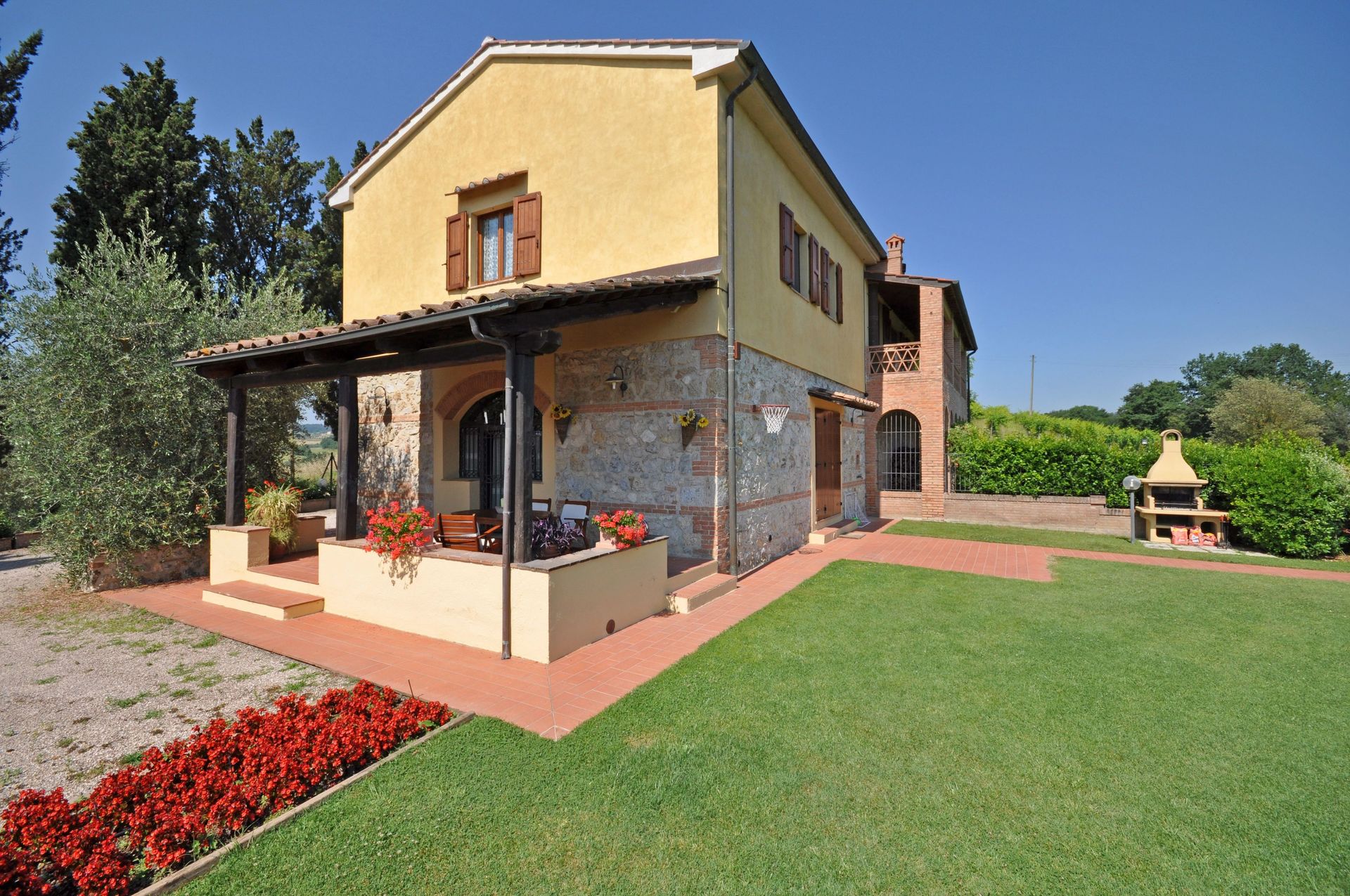 Welcoming recently restored house with private pool located a short distance from the lovely town of San Gimignano (5 km away). This house is a portion of a beautiful country-side villa and offers a large, well-kept private garden. Outside guests can also enjoy use of a nice portico overlooking the garden ideal for al-fresco dining.