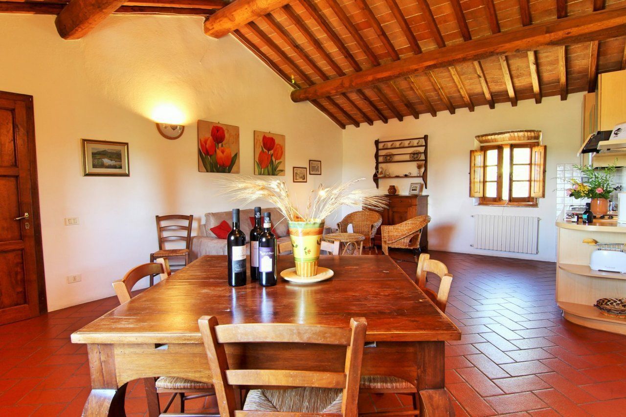 Typical Tuscan furnishings, with old-fashioned furniture, brick floor and beams