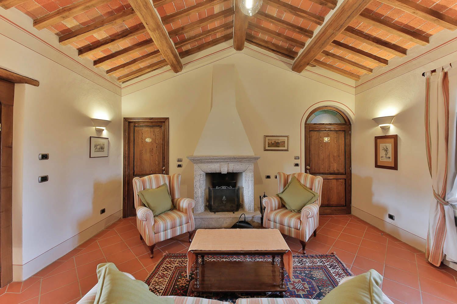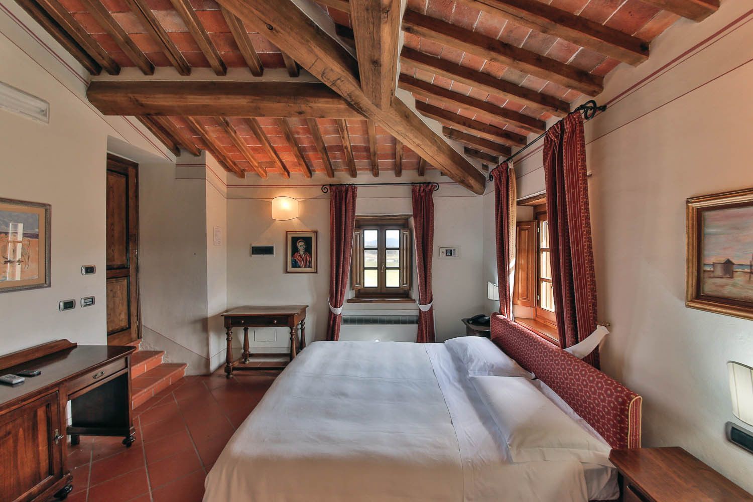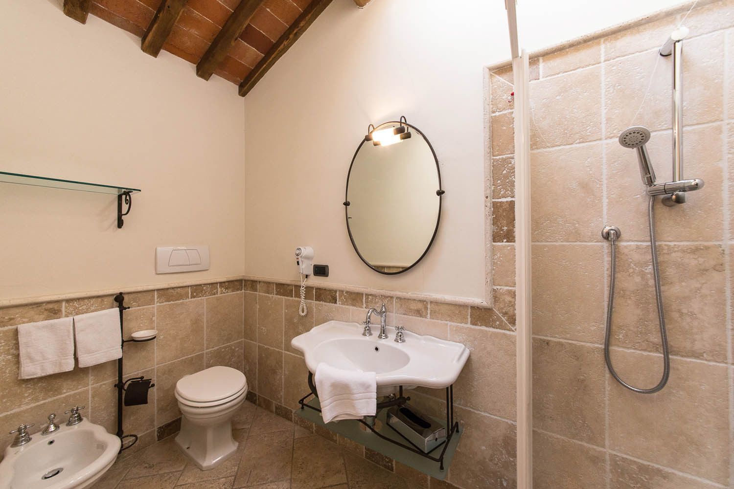 Large air conditioned, double/triple room with en suite bathroom. Tastefully furnished in traditional Tuscan style the room overlooks the polo club and open countryside. Features include terracotta flooring, double bed and a single sofa bed with luxury bedding, mini bar, satellite TV, telephone and safe. The en-suite bathroom is tastefully decorated in travertine and has a shower, WC, bidet, hairdryer and a complete set of complimentary toiletries.