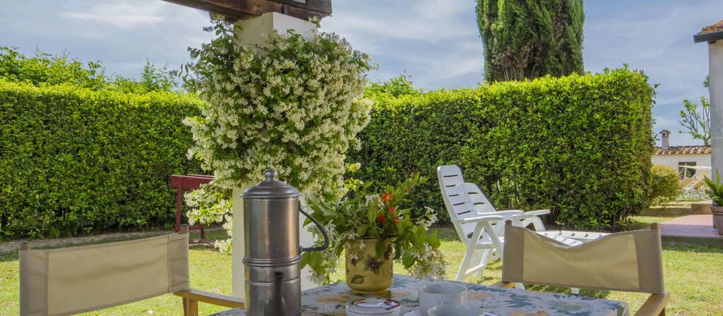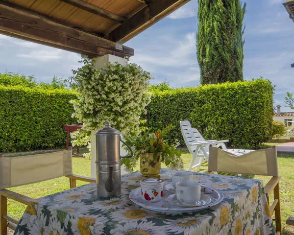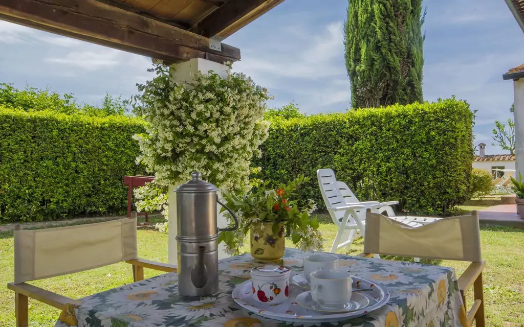 The outdoor spaces of "Casetta Ponticelli" are thoughtfully designed to enhance your enjoyment of the Tuscan countryside. The private 500 m2 garden is a welcoming retreat in itself, featuring a pergola that provides welcome shade during warm summer days, along with garden furniture for leisurely outdoor relaxation. A barbecue is also available, inviting you to enjoy al fresco dining in a truly picturesque setting. The shared 2,000 m2 park surrounding the property extends your outdoor living space considerably, offering a lush and verdant environment perfect for leisurely strolls or quiet moments in nature.