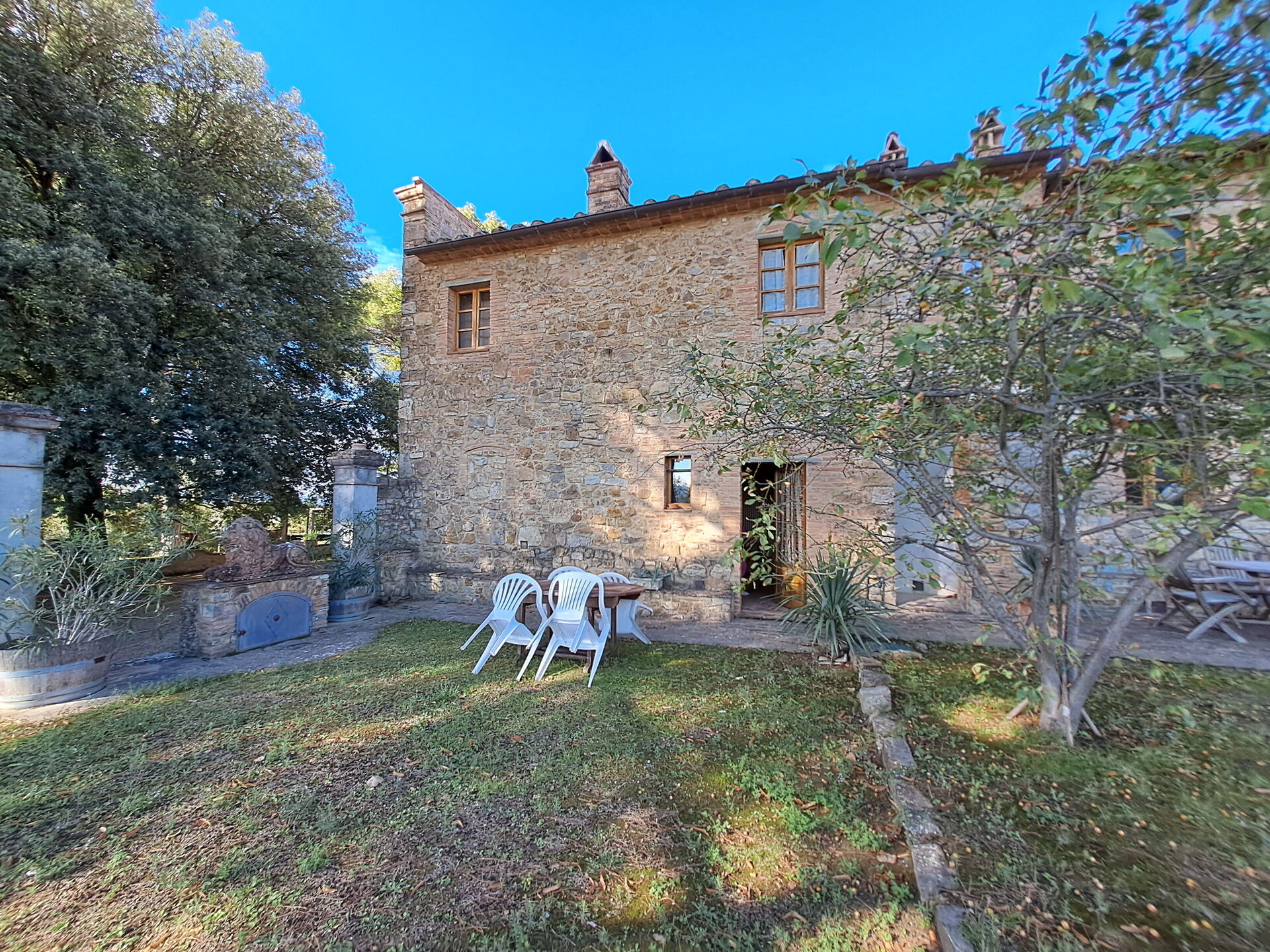 Ground floor: entrance, wc with washing machine, living room with dining area, double sofa bed and access to private furnished outdoor space, utility closet, stone kitchen with fireplace (dishwasher, oven, moka coffee maker, electric kettle, cooktop, refrigerator, freezer, toaster).