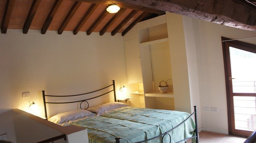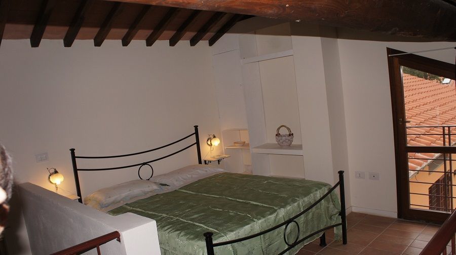 In the gallery above an open bedroom with double bed.