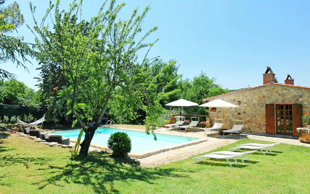 The outdoor spaces at Casale Verciano are thoughtfully designed to encourage leisure and enjoyment in a natural setting. The beautifully maintained garden, spanning the full extent of the fenced 5,000 m2 estate, provides a peaceful environment ideal for relaxing among the trees and open countryside. The private swimming pool, measuring 10 x 5 m with a depth of 140 cm, is available from 6 May to 30 September and is complemented by a dedicated WC in the pool area as well as an outdoor shower for the convenience of guests. Garden furniture is provided throughout the outdoor areas, creating comfortable spaces for sunbathing and unwinding. A barbecue is available for outdoor dining, and a volleyball area adds a recreational dimension to the exterior of the property. Adjacent to the swimming pool, there is a separate outbuilding equipped with a kitchen and living room, offering 2 sleeping possibilities. This additional space is particularly well suited for enjoying lunch in close proximity to the pool, making it a practical and pleasant extension of the outdoor living experience.