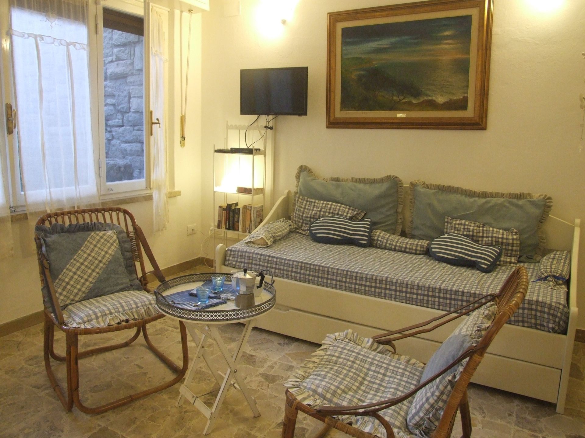 Access from the garden into the living room ( Sat TV), with 1 single sofà bed and another single sofà bed (on request and to be paid on the spot).