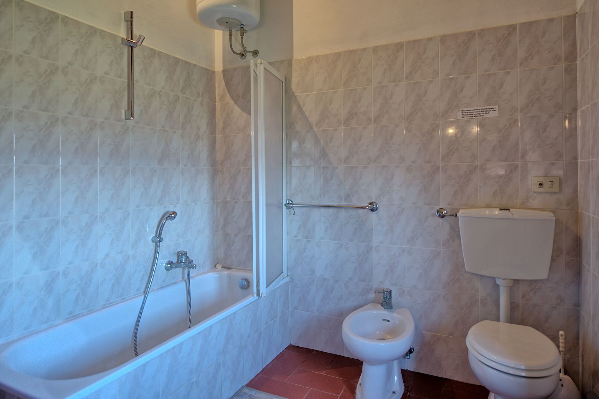 Ground floor: large hall with table, chairs, armchairs and fireplace, spacious lounge with sofa, hi-fi system, 2 large tables, passageway room with table and chairs, shower room with washing machine (without bidet).