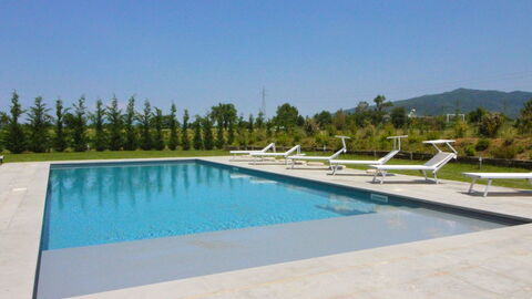 Het zwembad was keurig onderhouden net als het gazon erom heen. Er waren meer dan voldoende ligbedjes, stoelen en parasols aanwezig.